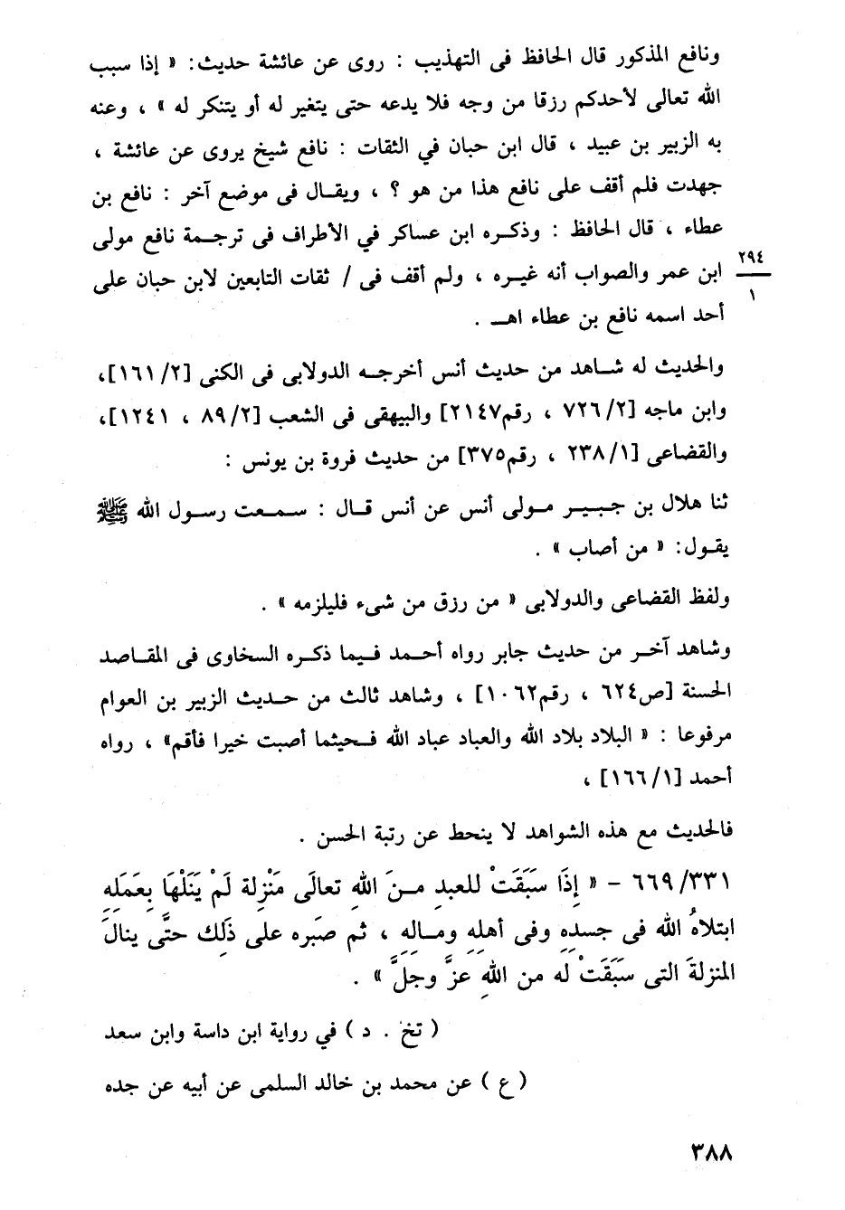 ونافع المذكور قال الحافظ في التهذيب: روى عن عائشة حديث: "إذا سبب اللَّه تعالى لأحدكم رزقا من وجه فلا يدعه حتى يتغير له أو يتنكر له"، وعنه به الزبير بن عبيد، قال ابن حبان في الثقات: نافع شيخ يروى عن عائشة، جهدت فلم أقف على نافع هذا من هو؟، ويقال في موضع آخر: نافع بن عطاء، قال الحافظ: وذكره ابن عساكر في الأطراف في ترجمة نافع مولى ابن عمر والصواب أنه غيره، ولم أقف في ثقات التابعين لابن حبان على أحد اسمه نافع بن عطاء اهـ.