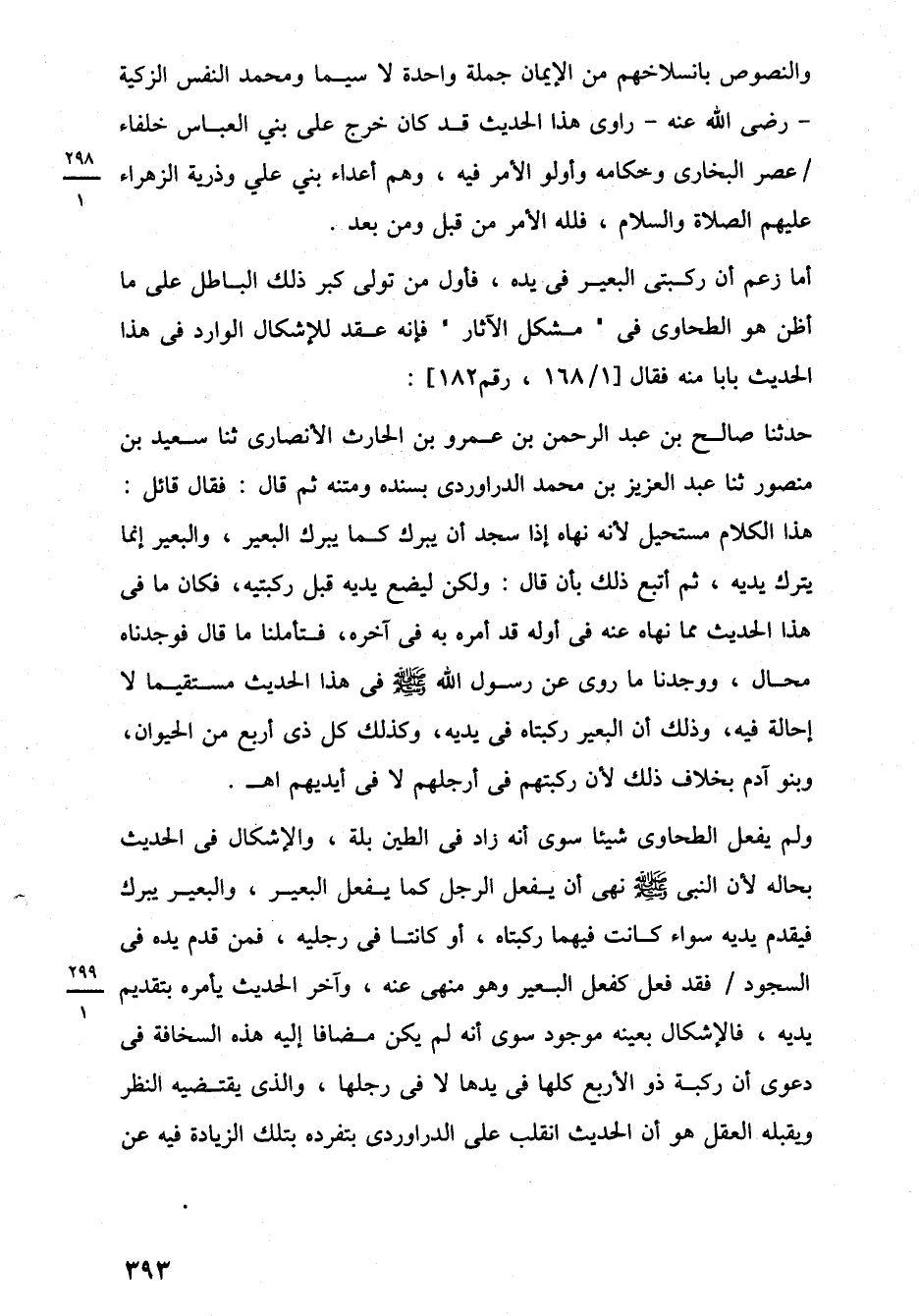 ولم يفعل الطحاوى شيئا سوى أنه زاد في الطين بلة، والإشكال في الحديث بحاله لأن النبي -صلى اللَّه عليه وسلم- نهى أن يفعل الرجل كما يفعل البعير، والبعير يبرك فيقدم يديه سواء كانت فيهما ركبتاه، أو كانتا في رجليه، فمن قدم يده في السجود فقد فعل كفعل البعير وهو منهى عنه، وآخر الحديث يأمره بتقديم يديه، فالإشكال بعينه موجود سوى أنه لم يكن مضافا إليه هذه السخافة في دعوى أن ركبة ذو الأربع كلها في يدها لا في رجلها، والذي يقتضيه النظر ويقبله العقل هو أن الحديث انقلب على الدراوردى بتفرده بتلك الزيادة فيه عن