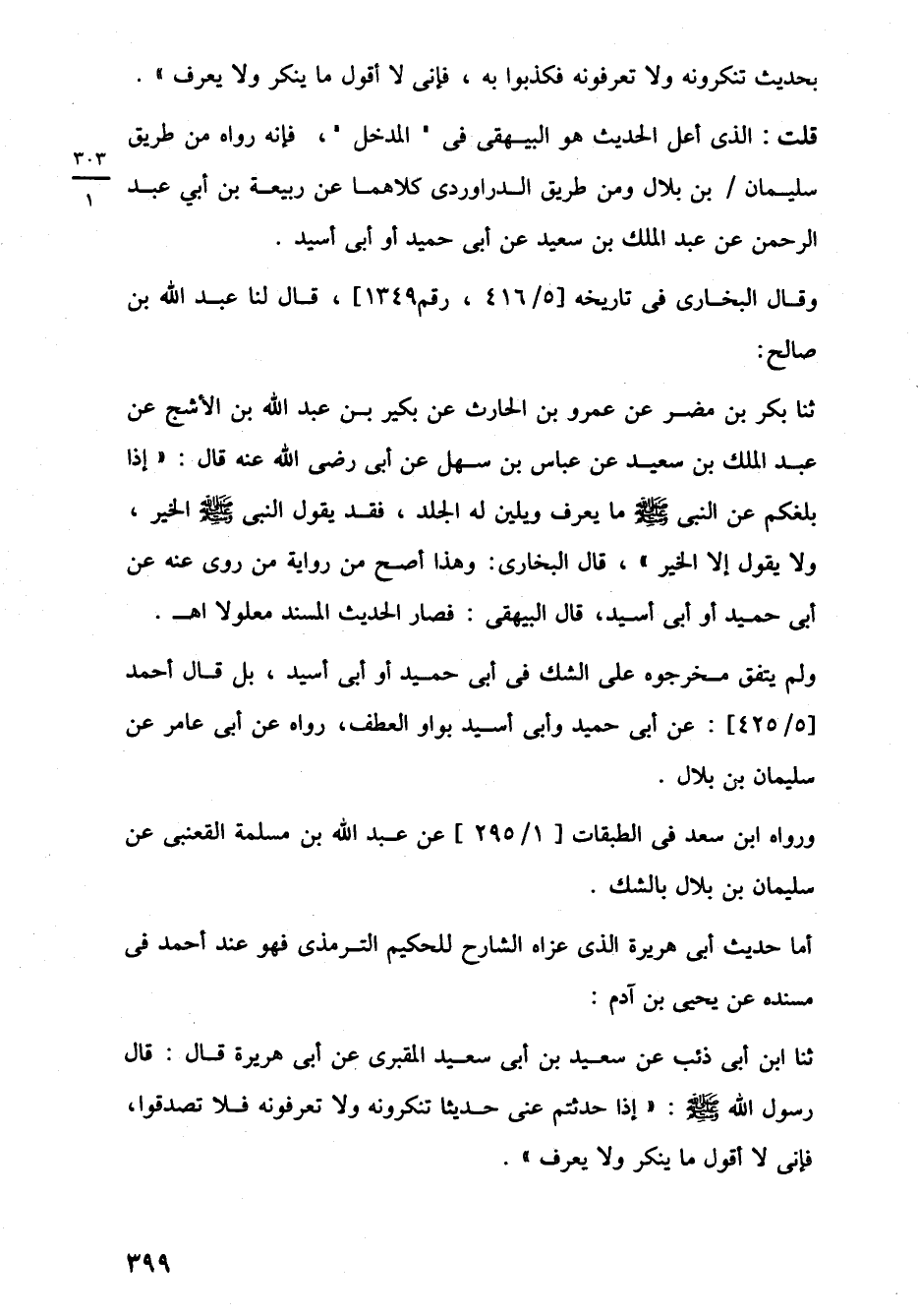 ثنا بكر بن مضر عن عمرو بن الحارث عن بكير بن عبد اللَّه بن الأشج عن عبد الملك بن سعيد عن عباس بن سهل عن أبي رضي اللَّه عنه قال: "إذا بلغكم عن النبي -صلى اللَّه عليه وسلم- ما يعرف ويلين له الجلد، فقد يقول النبي -صلى اللَّه عليه وسلم- الخير، ولا يقول إلا الخير"، قال البخارى: وهذا أصح من رواية من روى عنه عن أبي حميد أو أبي أسيد، قال البيهقى: فصار الحديث المسند معلولا اهـ.