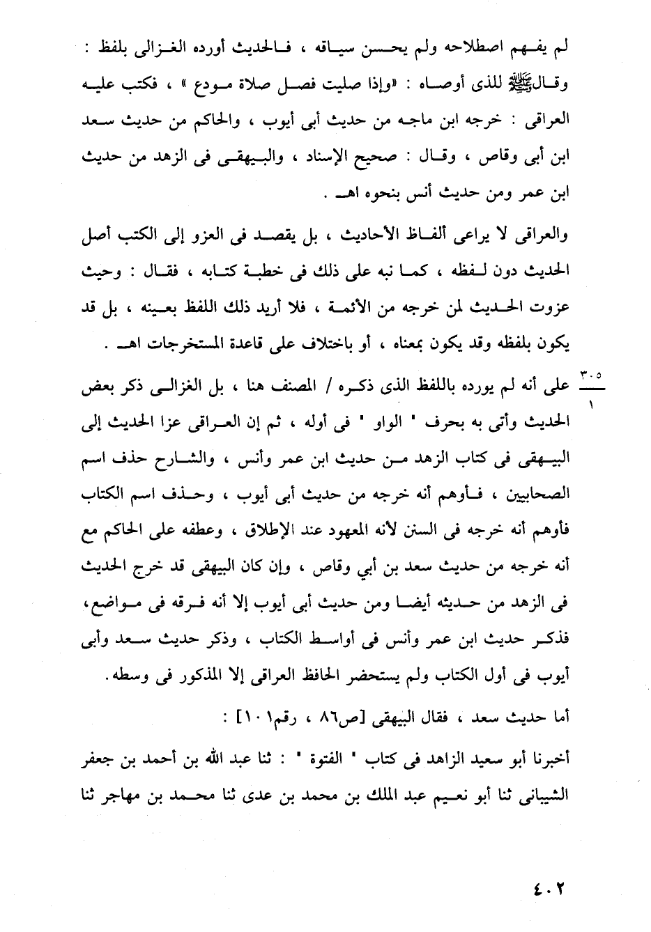 على أنه لم يورده باللفظ الذي ذكره المصنف هنا، بل الغزالى ذكر بعض الحديث وأتى به بحرف "الواو" في أوله، ثم إن العراقى عزا الحديث إلى البيهقى في كتاب الزهد من حديث ابن عمر وأنس، والشارح حذف اسم الصحابيين، فأوهم أنه خرجه من حديث أبي أيوب، وحذف اسم الكتاب فأوهم أنه خرجه في السنن لأنه المعهود عند الإطلاق، وعطفه على الحاكم مع أنه خرجه من حديث سعد بن أبي وقاص، وإن كان البيهقى قد خرج الحديث في الزهد من حديثه أيضا ومن حديث أبي أيوب إلا أنه فرقه في مواضع، فذكر حديث ابن عمر وأنس في أواسط الكتاب، وذكر حديث سعد وأبي أيوب في أول الكتاب ولم يستحضر الحافظ العراقى إلا المذكور في وسطه.