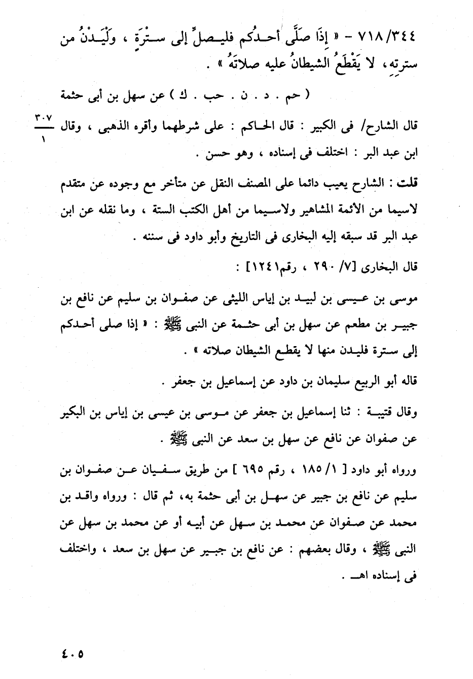 344/ 718 - "إِذَا صَلَّى أحدُكم فليصلِّ إلى ستْرَةٍ، وَلْيَدْنُ من سترتِهِ، لا يَقْطَعُ الشيطانُ عليه صلاتَهُ".