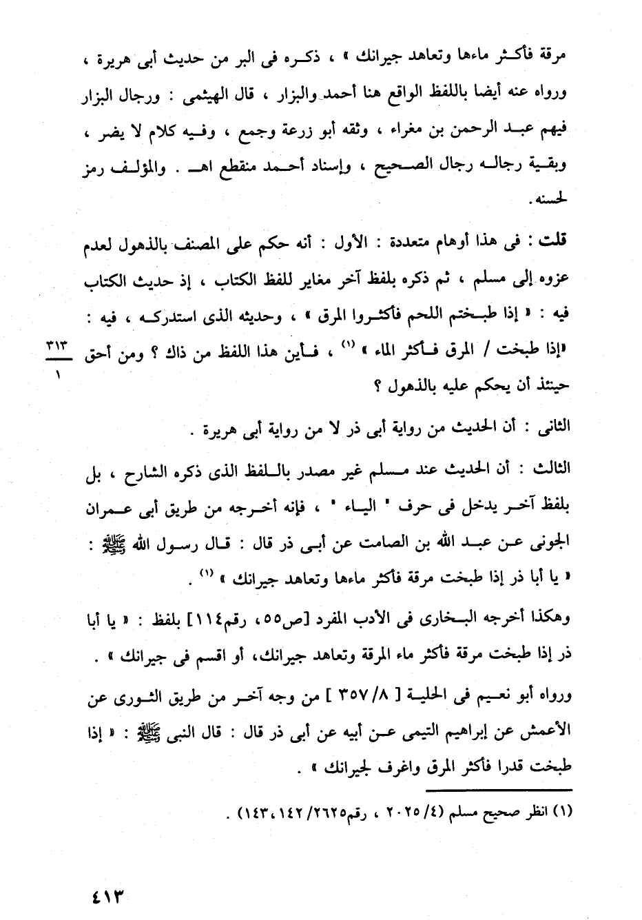 قلت: في هذا أوهام متعددة: الأول: أنه حكم على المصنف بالذهول لعدم عزوه إلى مسلم، ثم ذكره بلفظ آخر مغاير للفظ الكتاب، إذ حديث الكتاب فيه: "إذا طبختم اللحم فأكثروا المرق"، وحديثه الذي استدركه، فيه: "إذا طبخت المرق فأكثر الماء" (1)، فأين هذا اللفظ من ذاك؟ ومن أحق حينئذ أن يحكم عليه بالذهول؟