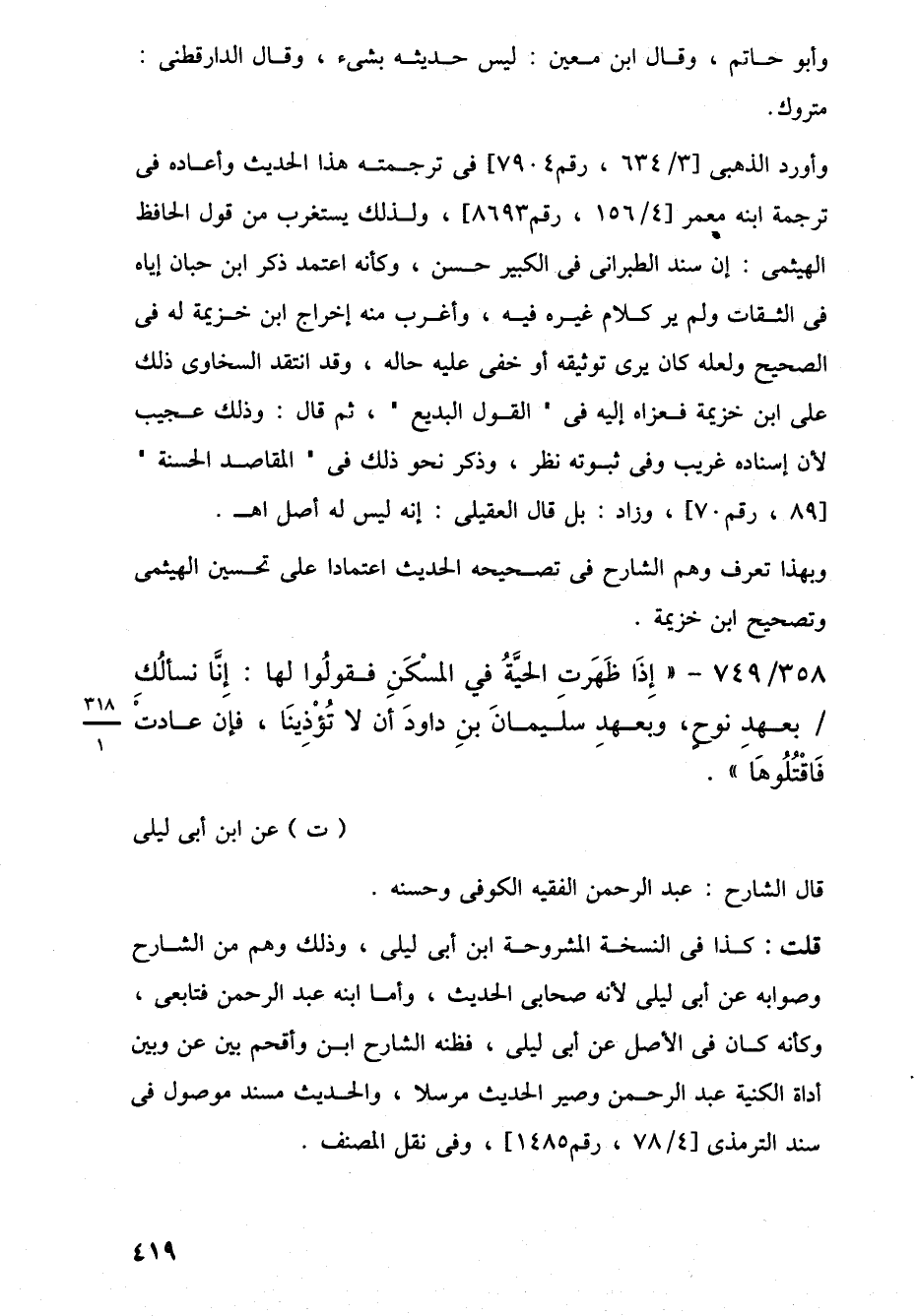 قلت: كذا في النسخة المشروحة ابن أبي ليلى، وذلك وهم من الشارح وصوابه عن أبي ليلى لأنه صحابى الحديث، وأما ابنه عبد الرحمن فتابعى، وكأنه كان في الأصل عن أبي ليلى، فظنه الشارح ابن وأقحم بين عن وبين أداة الكنية عبد الرحمن وصير الحديث مرسلا، والحديث مسند موصول في سند الترمذى [4/ 78، رقم 1485]، وفي نقل المصنف.