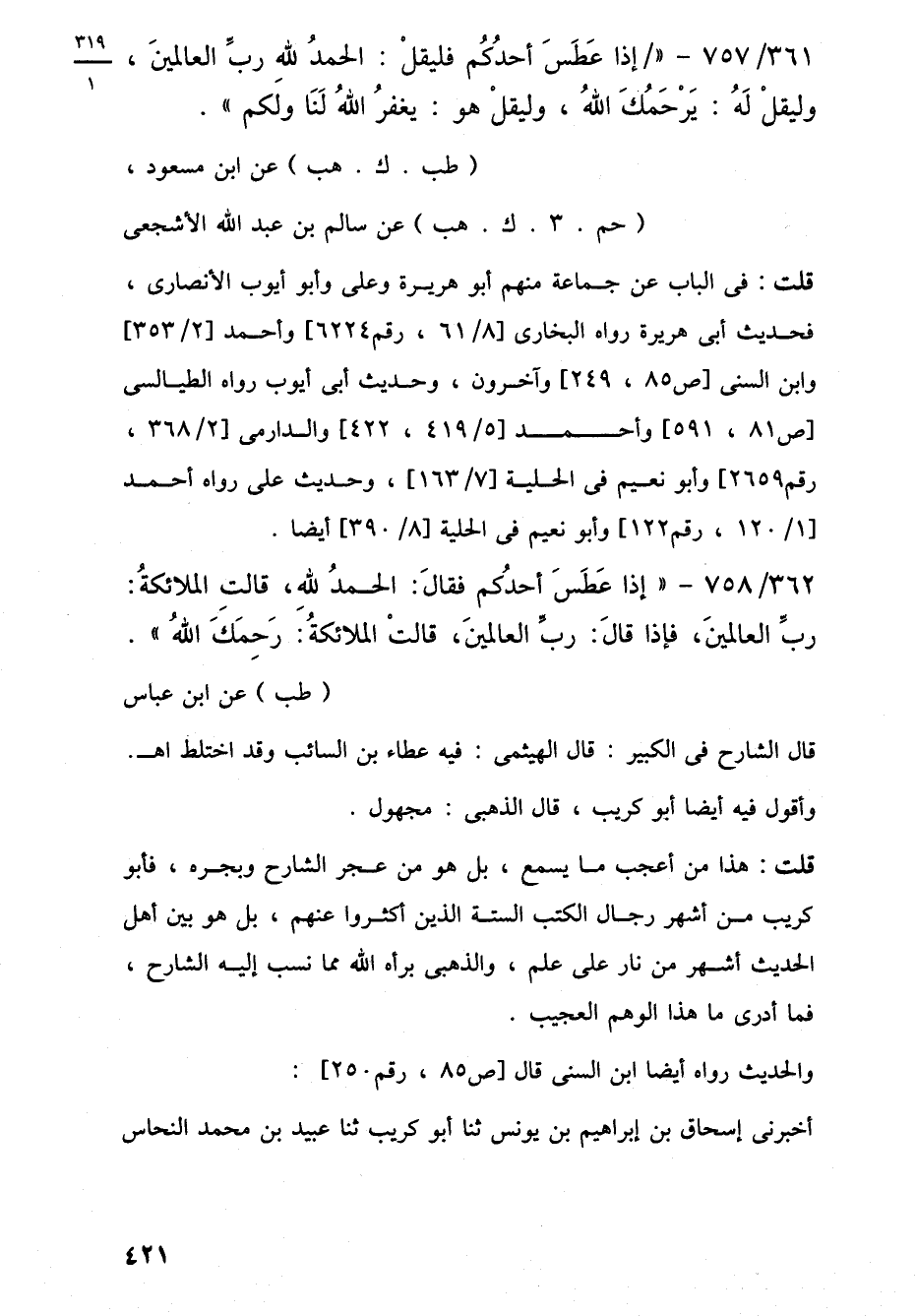 362/ 758 - " إذا عَطَسَ أحدُكم فقالَ: الحمدُ للَّه، قالتِ الملائكةُ: ربِّ العالمينَ، فإذا قالَ: ربِّ العالمينَ، قالتْ الملائكةُ، رَحِمَكَ اللَّهُ".