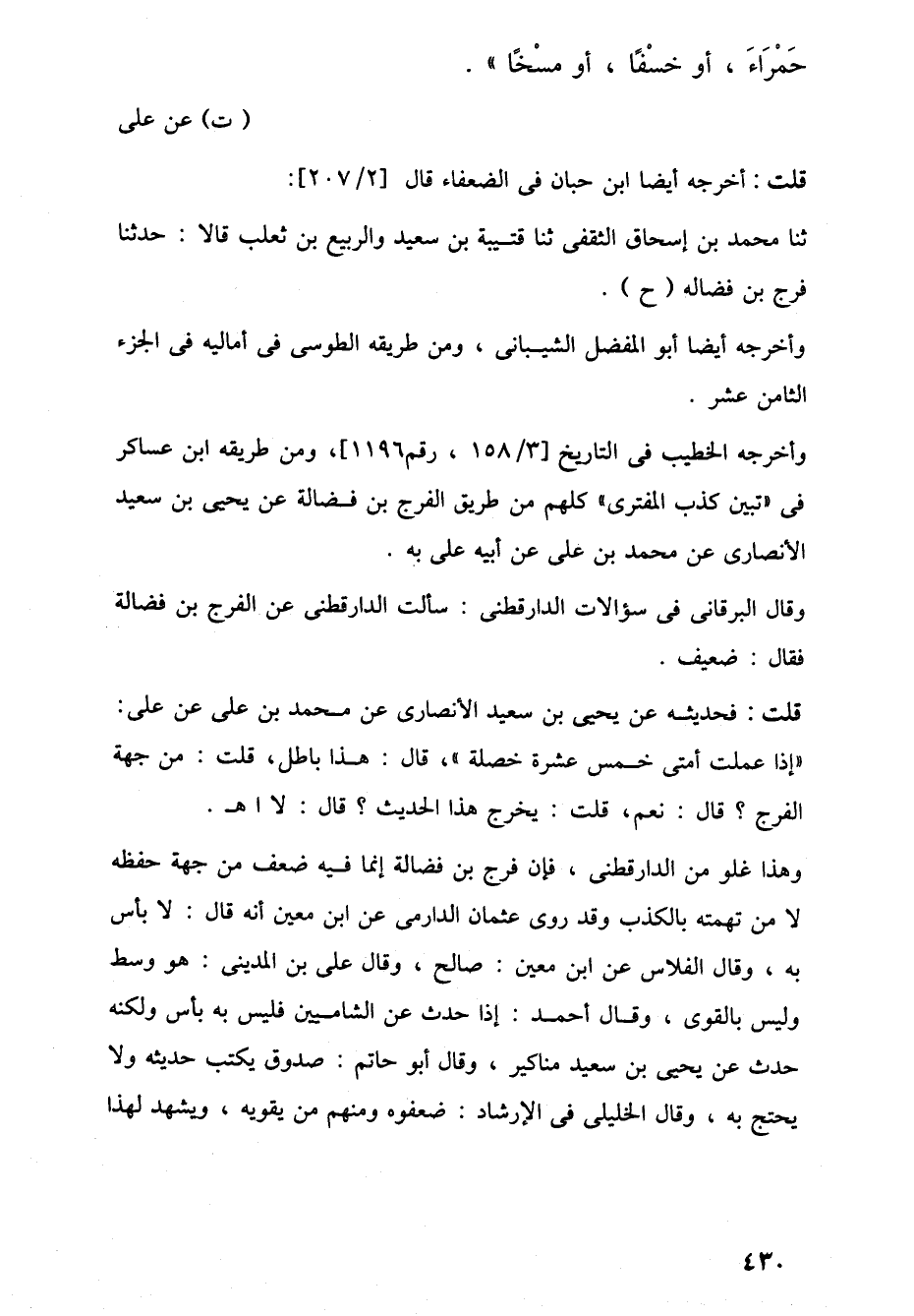وقال البرقانى في سؤالات الدارقطنى: سألت الدارقطنى عن الفرج بن فضالة فقال: ضعيف.