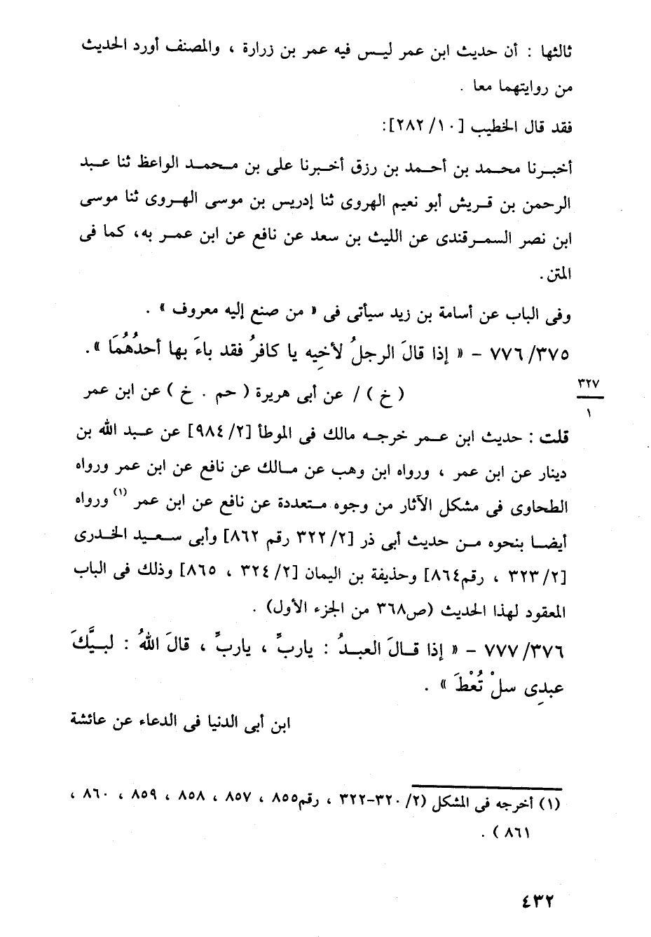 قلت: حديث ابن عمر خرجه مالك في الموطأ [2/ 984] عن عبد اللَّه بن دينار عن ابن عمر، ورواه ابن وهب عن مالك عن نافع عن ابن عمر ورواه الطحاوى في مشكل الآثار من وجوه متعددة عن نافع عن ابن عمر (¬1) ورواه أيضا بنحوه من حديث أبي ذر [2/ 322 رقم 862] وأبي سعيد الخدرى [2/ 323، رقم 864] وحذيفة بن اليمان [2/ 324، 865] وذلك في الباب المعقود لهذا الحديث (ص 368 من الجزء الأول).