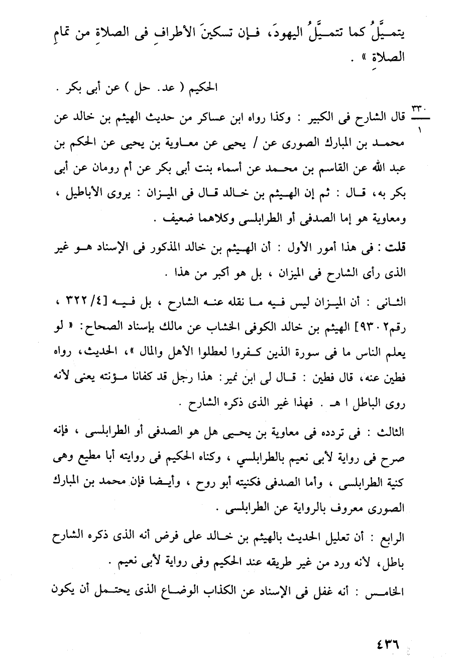الثانى: أن الميزان ليس فيه ما نقله عنه الشارح، بل فيه [4/ 322، رقم 9302] الهيثم بن خالد الكوفى الخشاب عن مالك بإسناد الصحاح: "لو يعلم الناس ما في سورة الذين كفروا لعطلوا الأهل والمال"، الحديث، رواه فطين عنه، قال فطين: قال لي ابن نمير: هذا رجل قد كفانا مؤنته يعنى لأنه روى الباطل اهـ. فهذا غير الذي ذكره الشارح.