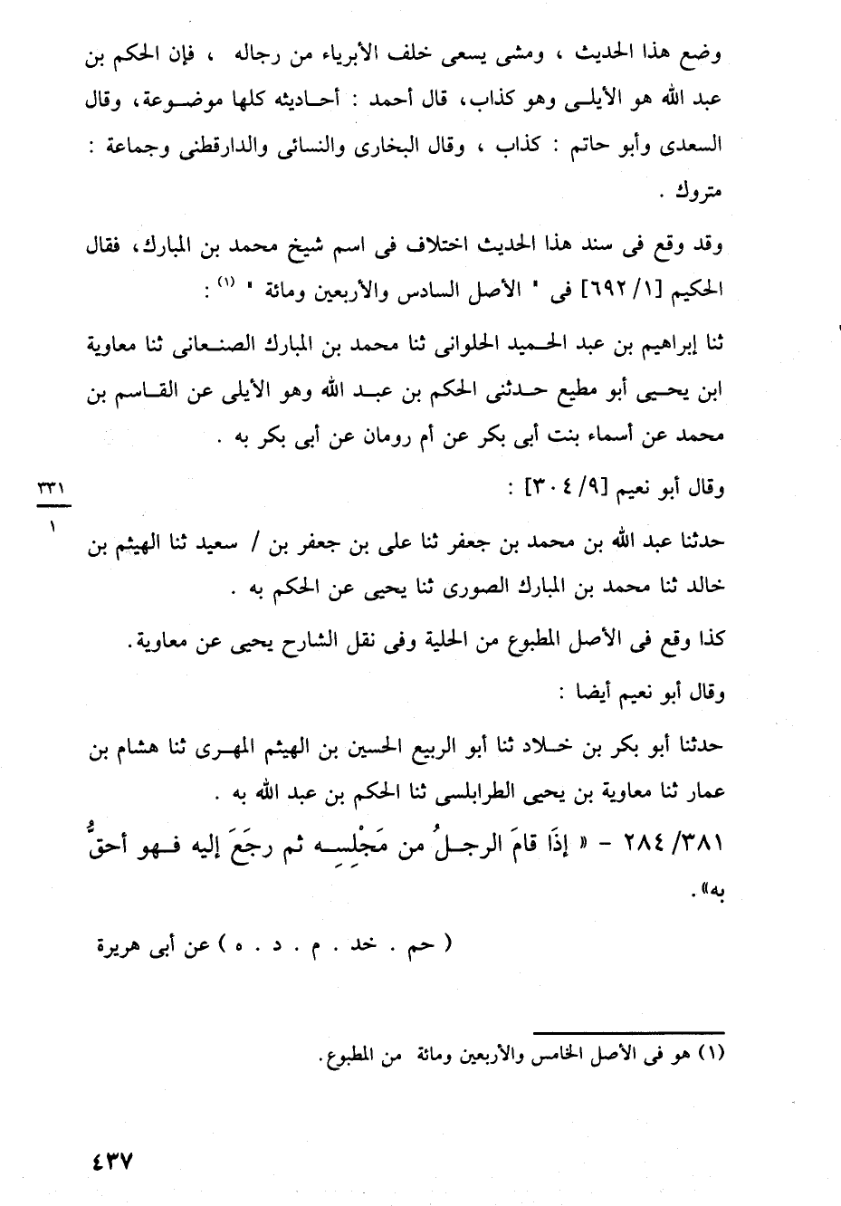 وضع هذا الحديث، ومشى يسعى خلف الأبرياء من رجاله، فإن الحكم بن عبد اللَّه هو الأيلى وهو كذاب، قال أحمد: أحاديثه كلها موضوعة، وقال السعدى وأبو حاتم: كذاب، وقال البخارى والنسائى والدارقطنى وجماعة: متروك.