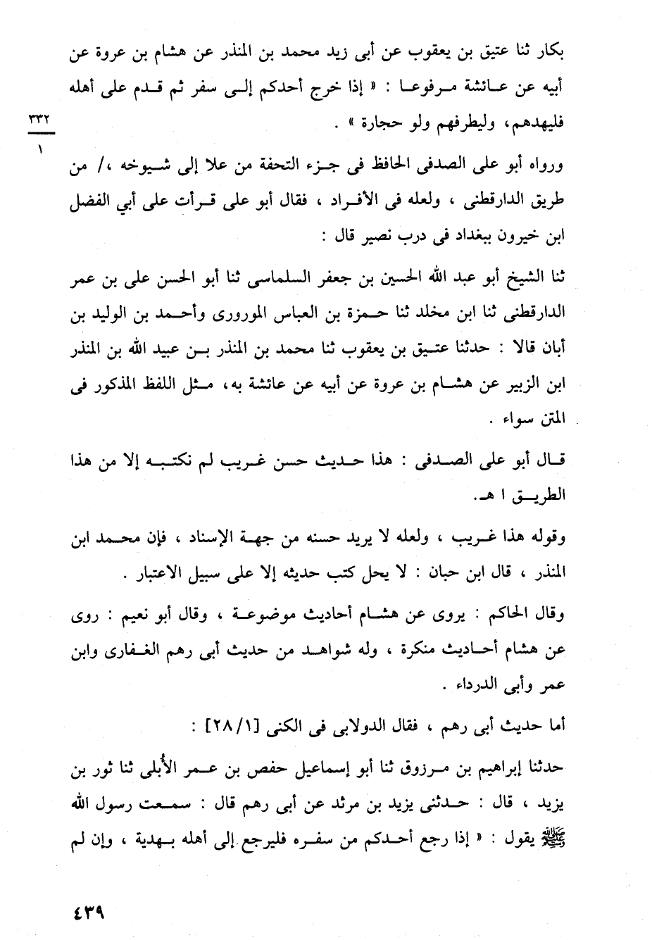 بكار ثنا عتيق بن يعقوب عن أبي زيد محمد بن المنذر عن هشام بن عروة عن أبيه عن عائشة مرفوعا: "إذا خرج أحدكم إلى سفر ثم قدم على أهله فليهدهم، وليطرفهم ولو حجارة".