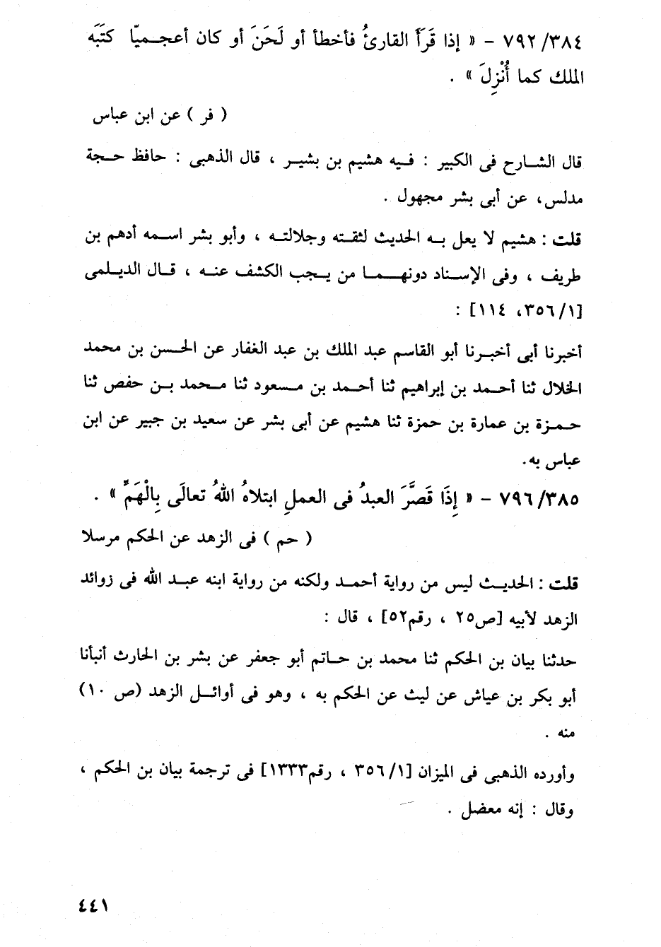 384/ 792 - "إذا قَرَأَ القارئ فأخطأ أو لَحَنَ أو كان أعجميّا كتَبَه الملك كما أُنْزِلَ". (فر) عن ابن عباس