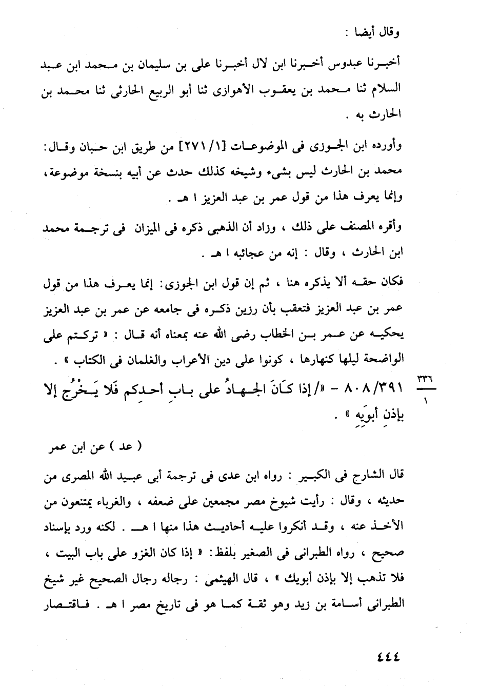 391/ 808 - "إِذَا كَانَ الجهادُ على بابِ أحدِكم فَلا يَخْرُج إلا بإذنِ أبوَيِهِ". (عد) عن ابن عمر