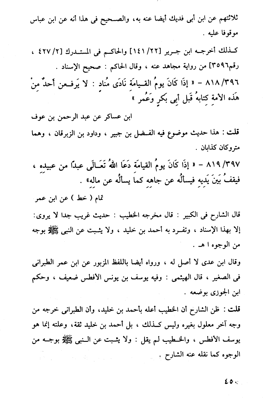 396/ 818 - "إِذَا كَانَ يومُ القيامَةِ نَادَى مُنادٍ: لا يَرفعن أحدٌ مِنْ هَذه الأمةِ كِتابهُ قَبل أبِي بكرٍ وَعُمر"