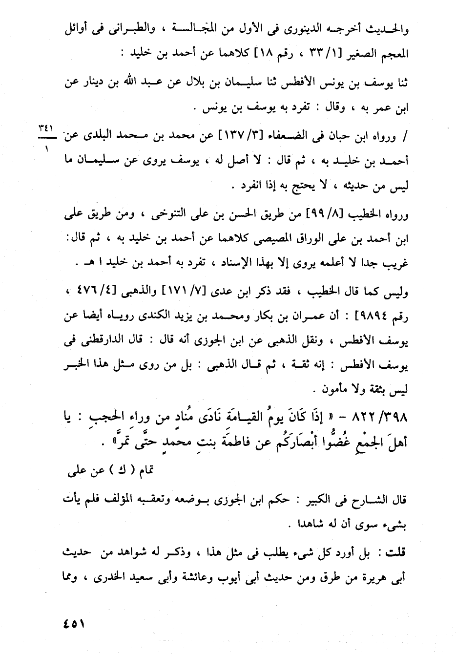 398/ 822 - "إِذَا كَانَ يومُ القيامَةِ نَادَى مُنادٍ من وراءِ الحجبِ: يا أهلَ الجمْعِ غُضُّوا أبْصَارَكُم عن فاطمَة بنتِ محمدٍ حتَّى تمرَّ".