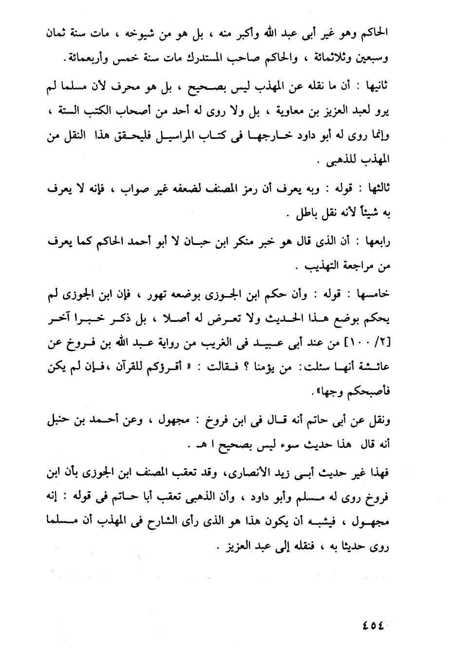 ثانيها: أن ما نقله عن المهذب ليس بصحيح، بل هو محرف لأن مسلما لم يرو لعبد العزيز بن معاوية، بل ولا روى له أحد من أصحاب الكتب الستة، وإنما روى له أبو داود خارجها في كتاب المراسيل فليحقق هذا النقل من المهذب للذهبى.