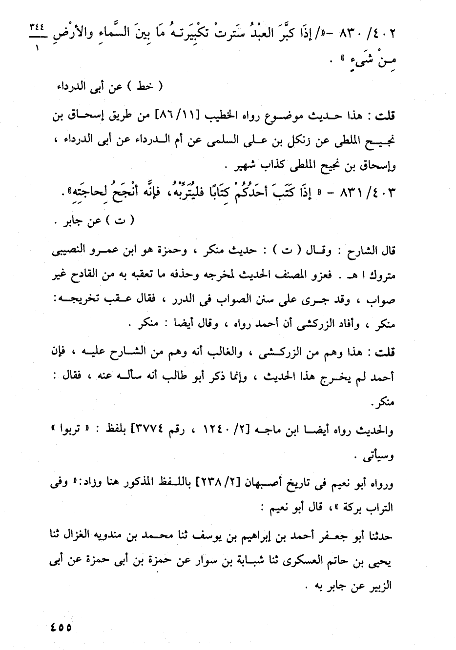 قال الشارح: وقال (ت): حديث منكر، وحمزة هو ابن عمرو النصيبى متروك اهـ. فعزو المصنف الحديث لمخرجه وحذفه ما تعقبه به من القادح غير صواب، وقد جرى على سنن الصواب في الدرر، فقال عقب تخريجه: منكر، وأفاد الزركشى أن أحمد رواه، وقال أيضا: منكر.