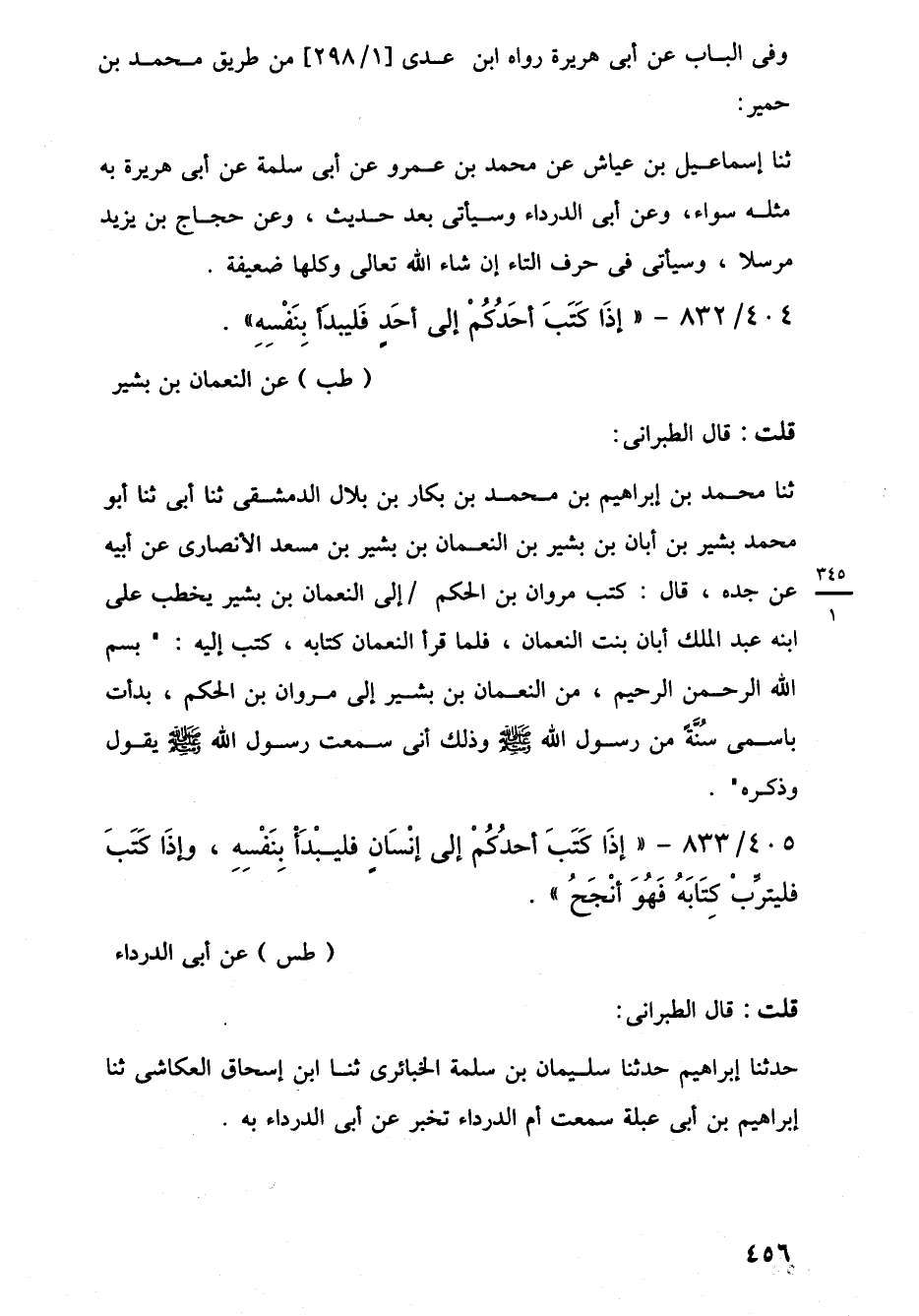 404/ 832 - "إِذَا كَتَبَ أَحَدُكُمْ إلى أحَدٍ فَليبدَأ بِنَفْسِهِ". (طب) عن النعمان بن بشير