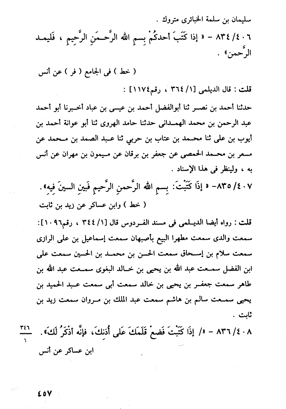 406/ 834 - "إِذَا كَتَبَ أَحدكُمْ بِسمِ اللَّه الرَّحمَنِ الرَّحِيمِ، فَليمد الرَّحمن". (خط) في الجامع (فر) عن أنس