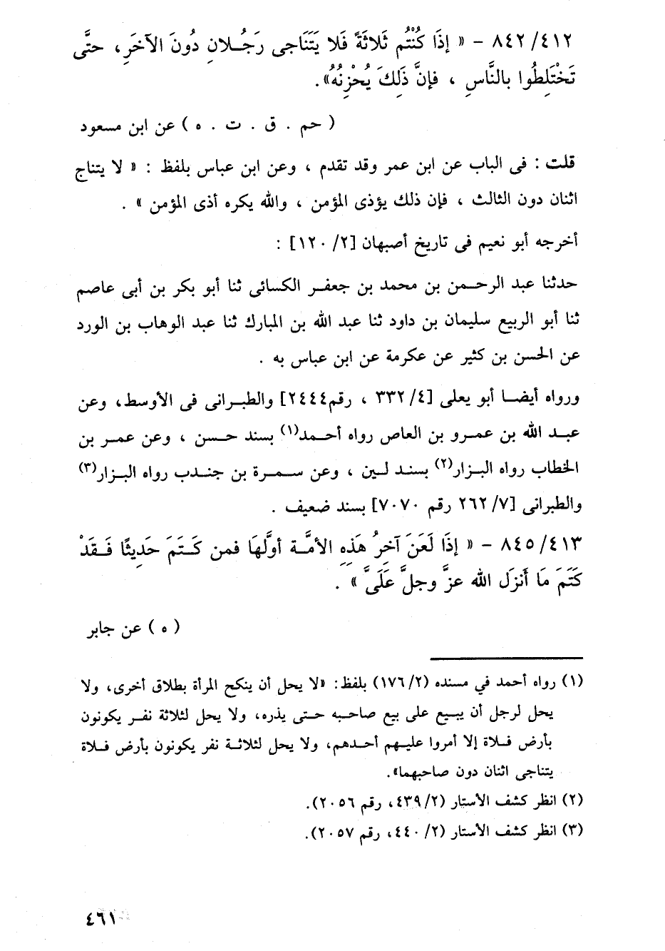 412/ 842 - "إِذَا كُنْتُم ثَلاثَةً فَلا يَتَنَاجى رَجُلانِ دُونَ الآخَرِ، حتَّى تَخْتَلِطُوا بالنَّاسِ، فإنَّ ذَلِكَ يُحْزِنُهُ".