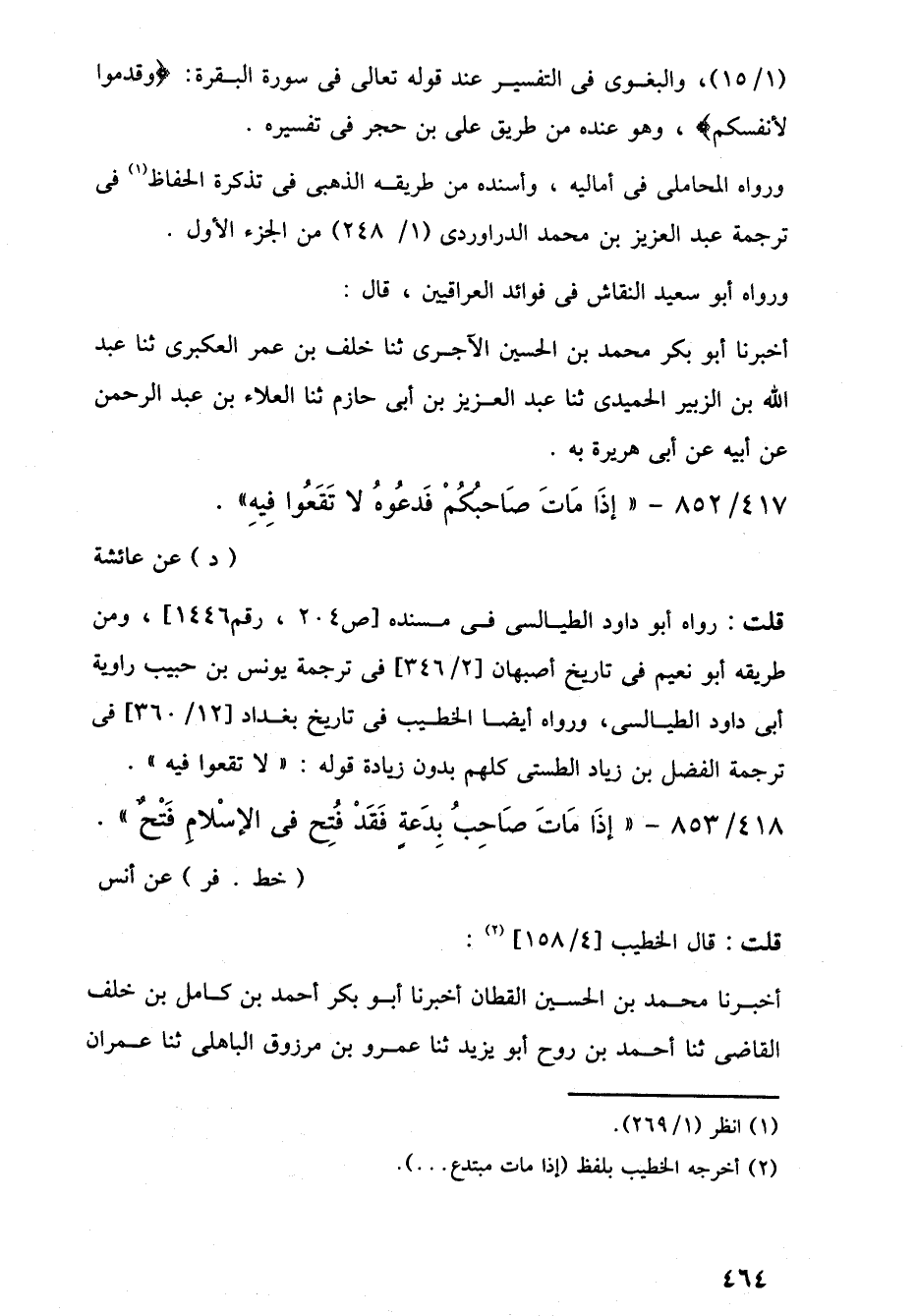 417/ 852 - "إذَا مَاتَ صَاحبُكُمْ فَدعُوهُ لا تَقَعُوا فِيهِ". (د) عن عائشة