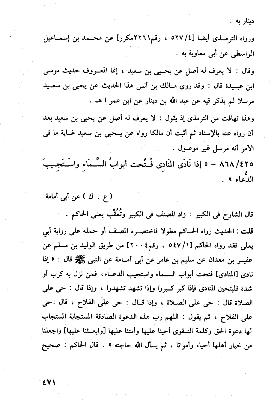 425/ 868 - "إِذَا نَادَى المنَادِى فُتِّحت أبوابُ السَّمَاءِ واسْتَجِيبَ الدُّعاء". (ع. ك) عن أبي أمامة