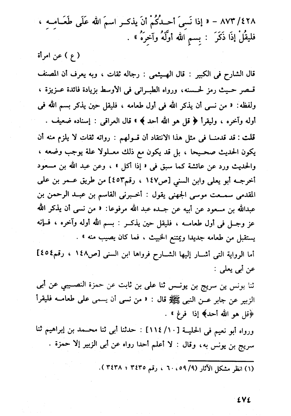 428/ 873 - "إِذَا نَسِيَ أحدُكُمْ أنَ يذكر اسمَ اللَّه عَلَى طَعَامِهِ، فليقُلْ إذَا ذَكَرَ: بِسم اللَّه أوَّلَهُ وآخِرَهُ". (ع) عن امرأة
