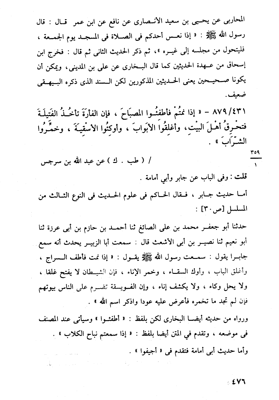 431/ 879 - "إِذَا نمتُمْ فأطفِئُوا المصبَاحَ، فإن الفأرَةَ تأخُذُ الفَتيلَةَ فتحْرِقُ أهْلَ البيْتِ، وأغلِقُوا الأبَوابَ، وأوكِئُوا الأسْقِيَةَ، وخمِّرُوا الشّرَابَ".