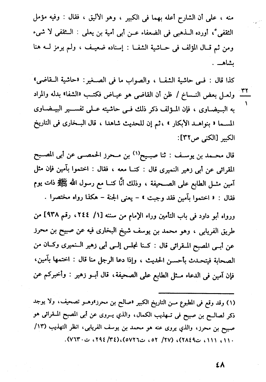 قال محمد بن يوسف: ثنا صبيح (¬1) بن محرز الحمصى عن أبي المصبح المقرائى عن أبي زهير النميرى قال: كنا معه، فقال: اختموا بآمين فإن مثل آمين مثل الطابع على الصحيفة، وذلك أنا كنا مع رسول اللَّه -صلى اللَّه عليه وسلم- ذات يوم فقال: "اختموا بآمين فقد وجبت" -يعنى الجنة- هكذا رواه مختصرا.