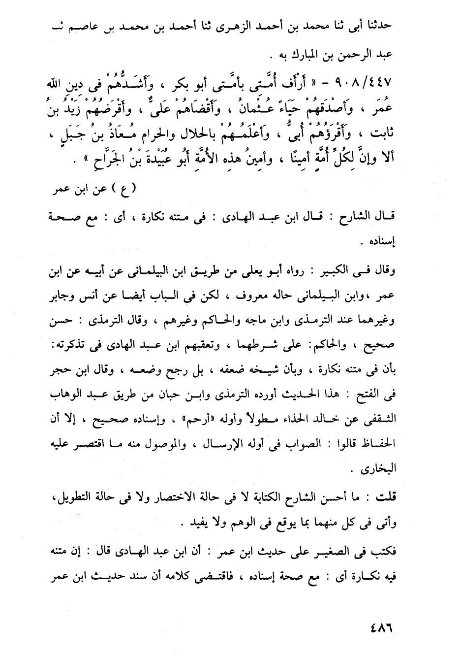447/ 908 - "أَرْأَف أُمَّتِى بأمَّتى أبو بكر، وَأَشَدُّهُمْ في دِينِ اللَّه عُمَر، وَأصْدَقهُمْ حَيَاءً عُثْمانُ، وَأَقْضَاهُمْ عَليٌّ، وأقْرَضُهُمْ زَيْدُ بنُ ثابت، وَأَقْرَؤُهُمْ أُبيُّ، وَأعْلَمُهُمْ بالحلال والحرام مُعَاذُ بنُ جَبَلٍ، ألا وإنَّ لِكُلِّ أُمّةٍ أمِينًا، وأمِينُ هذِه الأُمَّةِ أبُو عُبَيْدةَ بْنُ الجَرَّاحِ".