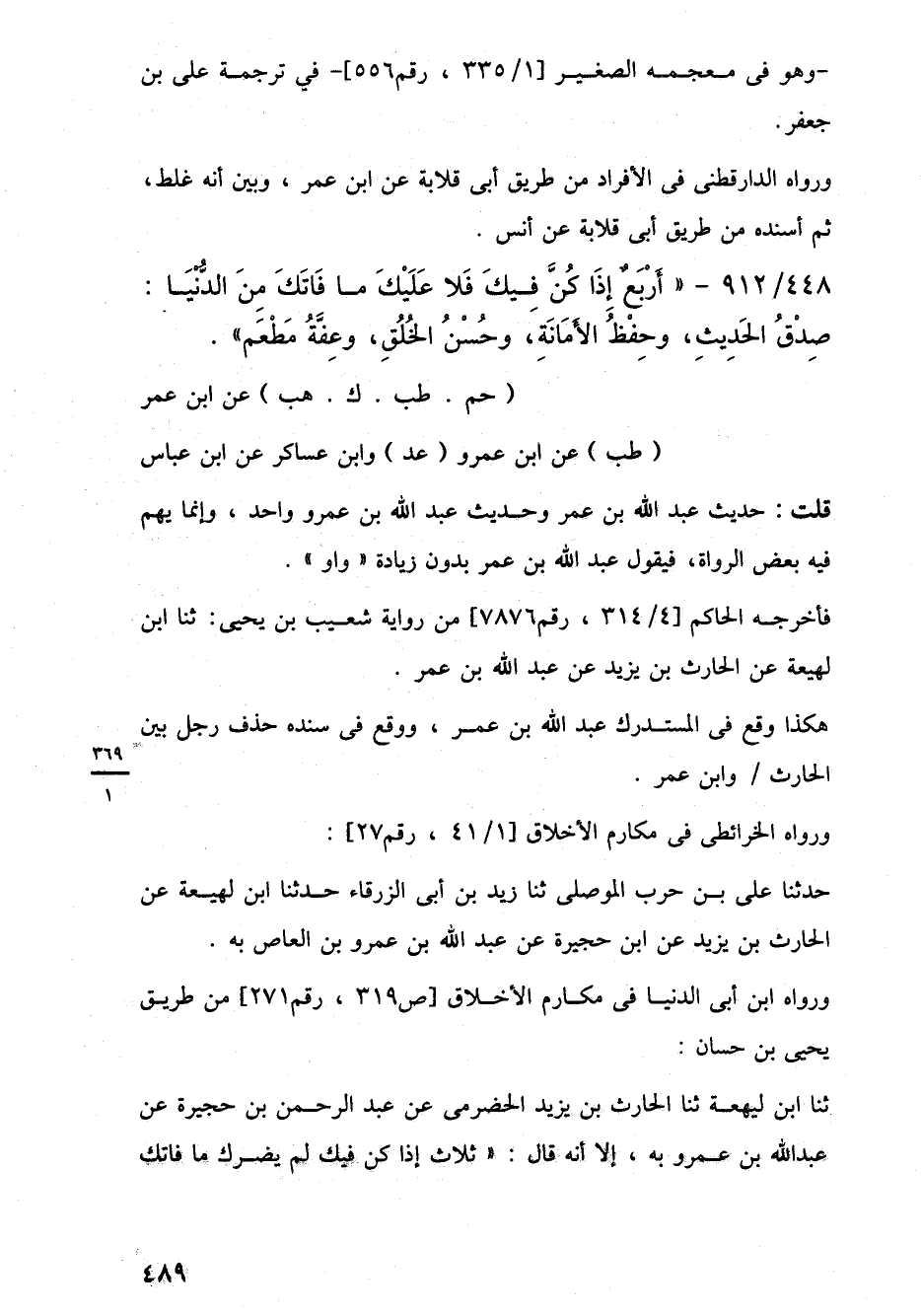 حدثنا على بن حرب الموصلى ثنا زيد بن أبي الزرقاء حدثنا ابن لهيعة عن الحارث بن يزيد عن ابن حجيرة عن عبد اللَّه بن عمرو بن العاص به.