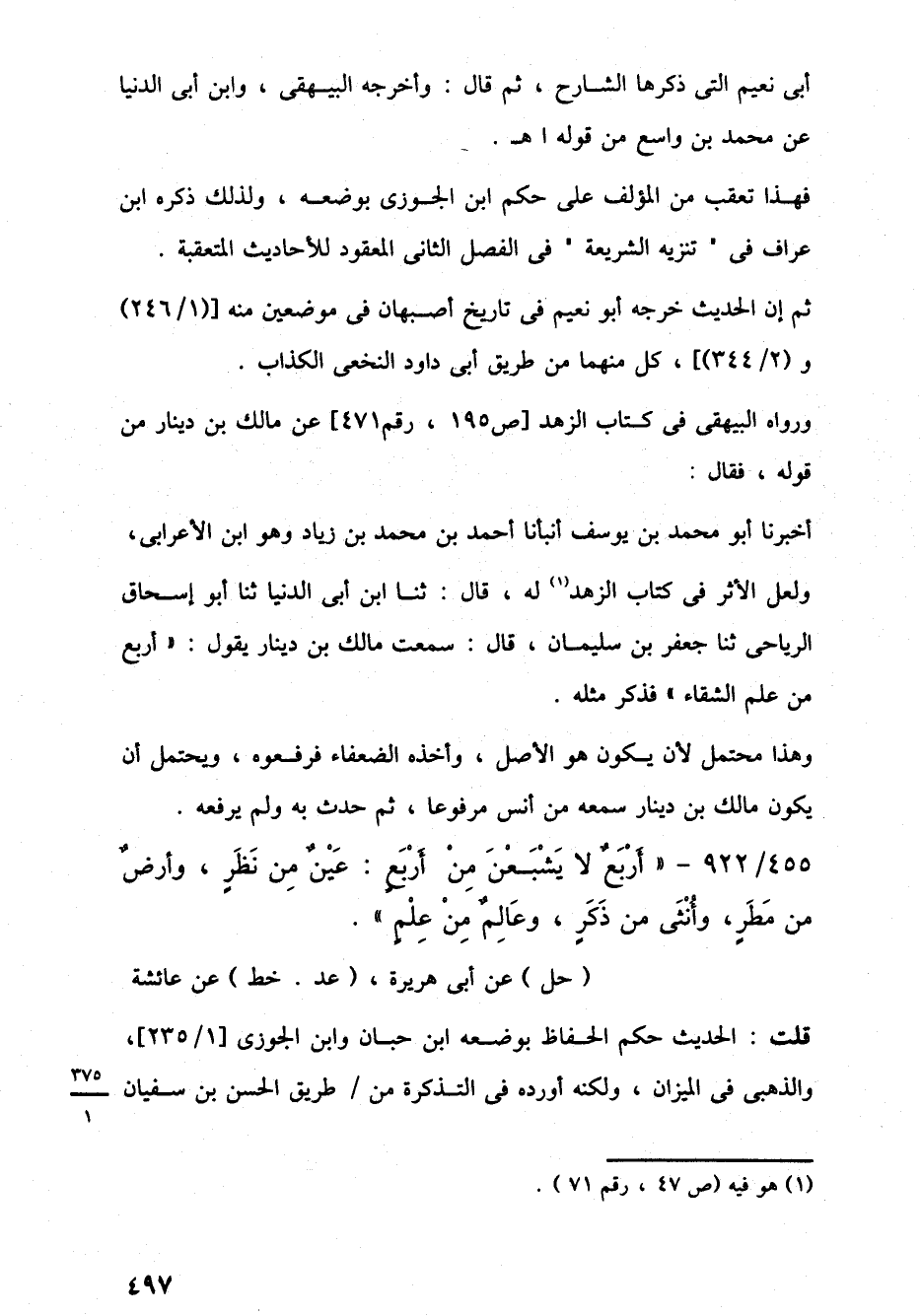 455/ 922 - "أَرْبَعٌ لا يَشْبَعْنَ مِنْ أَرْبَعٍ: عَيْنٌ مِن نَظَرٍ، وأرضٌ من مَطَرٍ، وأُنْثَى من ذَكَرٍ، وعَالِمٌ مِنْ عِلْمٍ".