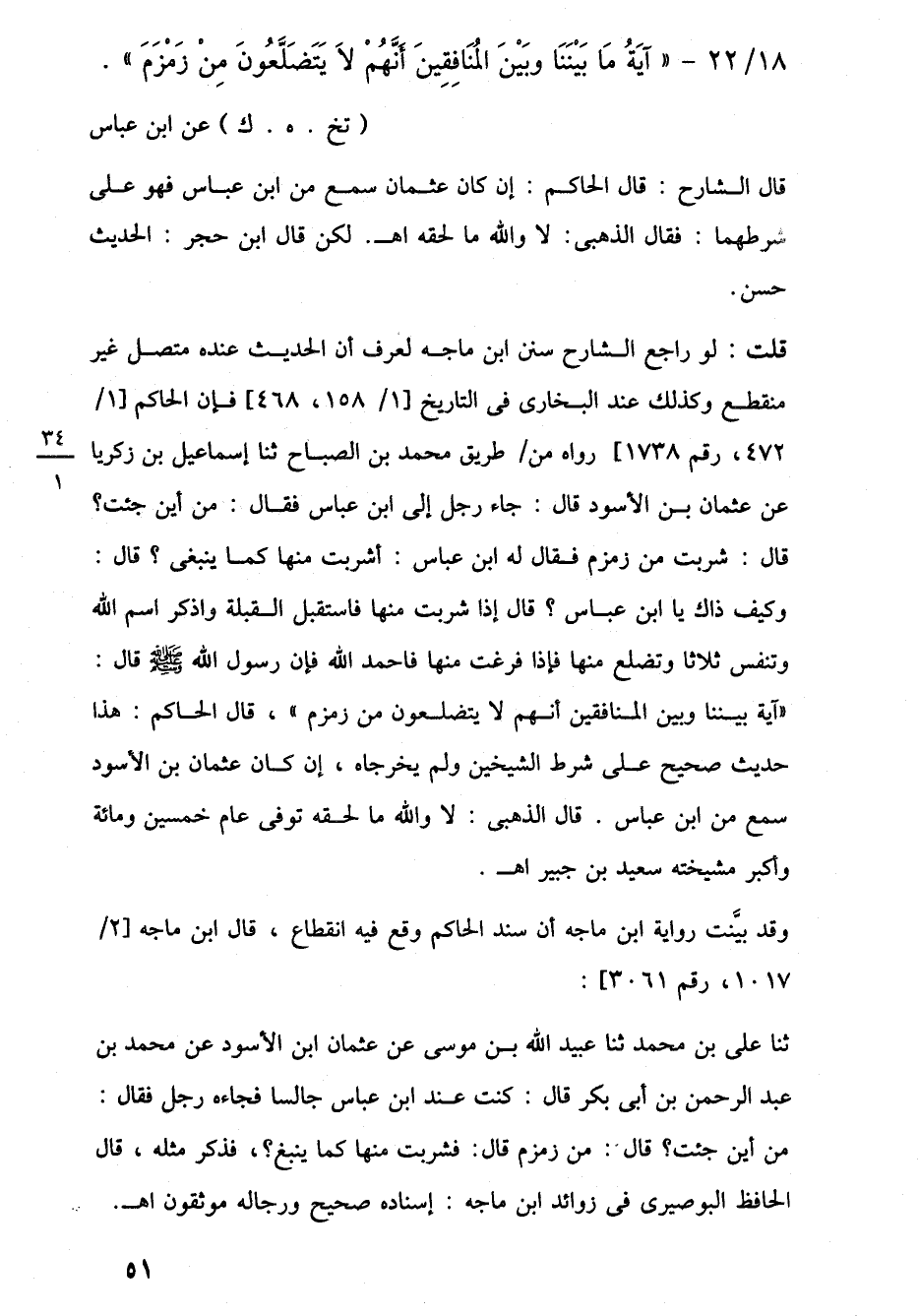 ثنا على بن محمد ثنا عبيد اللَّه بن موسى عن عثمان ابن الأسود عن محمد بن عبد الرحمن بن أبي بكر قال: كنت عند ابن عباس جالسا فجاءه رجل فقال: من أين جئت؟ قال: من زمزم قال: فشربت منها كما ينبغ؟، فذكر مثله، قال الحافظ البوصيرى في زوائد ابن ماجه: إسناده صحيح ورجاله موثقون اهـ.