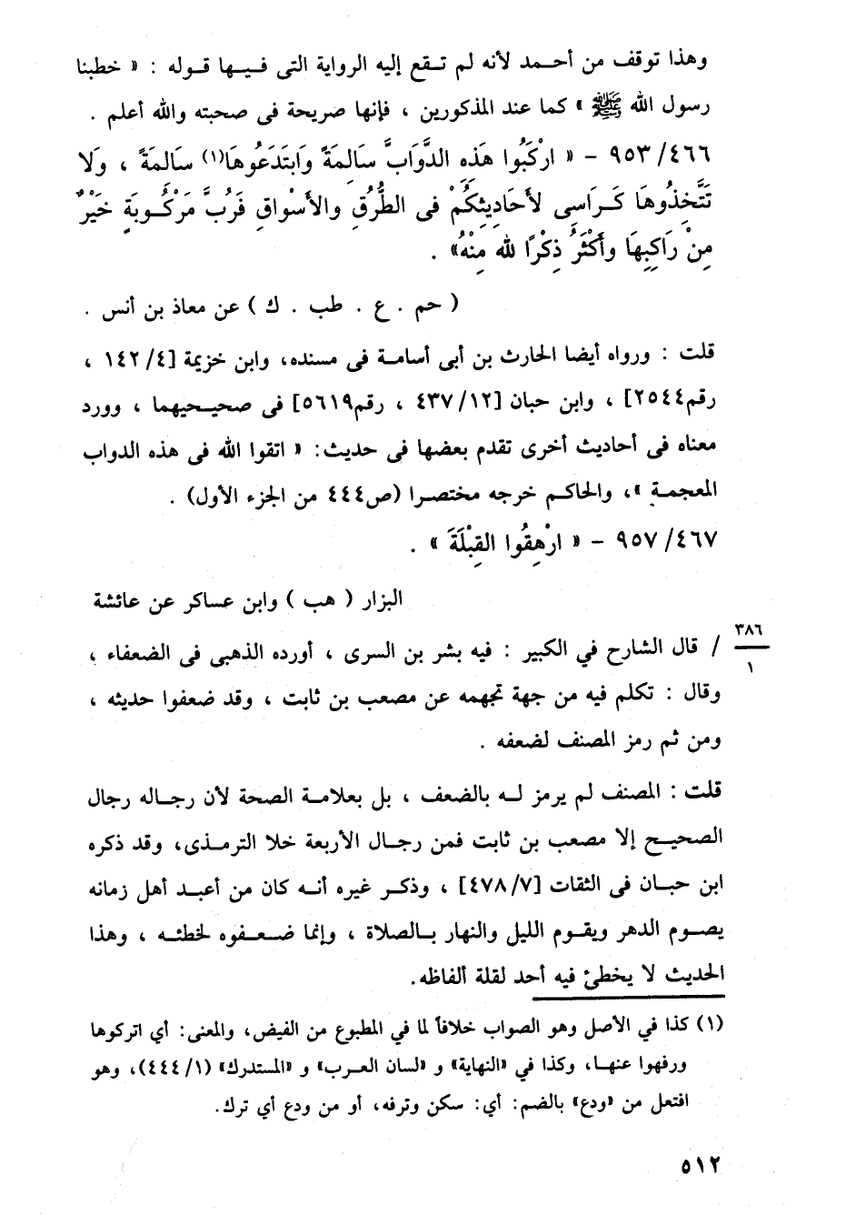 466/ 953 - "ارْكَبُوا هَذه الدَّوَابَّ سَالِمَةً وَابتَدَعُوهَا (¬1) سَالمَةً، وَلا تَتَّخذُوهَا كَرَاسى لأَحَادِيثِكُمْ في الطُّرُقِ والأَسْواقِ فَرُبَّ مَرْكُوبَةٍ خَيْرٌ مِنَ رَاكِبِهَا وأَكْثَرُ ذِكْرًا للَّه مِنْهُ".