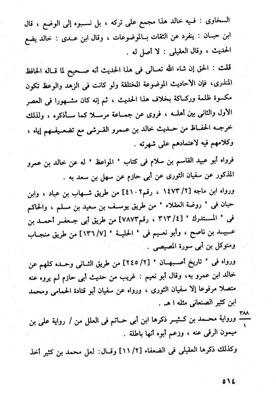 السخاوى: فيه خالد هذا مجمع على تركه، بل نسبوه إلى الوضع، قال ابن حبان: ينفرد عن الثقات بالموضوعات، وقال ابن عدى: خالد يضع الحديث، وقال العقيلى: لا أصل له.