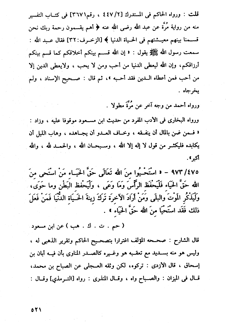 475/ 973 - "اسْتَحْيُوا مِنَ اللَّه تَعَالَى حَقَّ الحَيَاء مَنْ اسْتَحى مِنَ اللَّه حَقَّ الحَيَاءِ فَلْيَحْفَظِ الرَّأْسَ وَمَا وَعَى، وَلْيَحْفظِ البَطْن وما حَوَى، وَلْيَذْكُرِ المَوْتَ والبلَى وَمَنْ أَرَادَ الآخِرَة تَرَكَ زِينةَ الحَيَاةِ الدُّنيَا فَمَنْ فَعَلَ ذلك فَقَد اسْتحْيَا مِنَ اللَّه حَقَّ الحَيَاءِ".