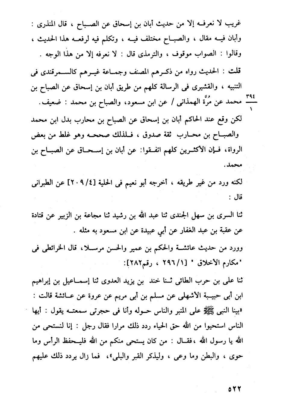 ثنا على بن حرب الطائى ثنا خند بن يزيد العدوى ثنا إسماعيل بن إبراهيم ابن أبي حبيبة الأشهلى عن مسلم بن أبي مريم عن عروة عن عائشة قالت: "بينا النبي -صلى اللَّه عليه وسلم- على المنبر والناس حوله وأنا في حجرتى سمعته يقول: أيها الناس استحيوا من اللَّه حق الحياء ردد ذلك مرارا فقال رجل: إنا لنستحى من اللَّه يا رسول اللَّه، فقال: من كان يستحى منكم من اللَّه فليحفظ الرأس وما حوى، والبطن وما وعى، وليذكر القبر والبلى"، فما زال يردد ذلك عليهم