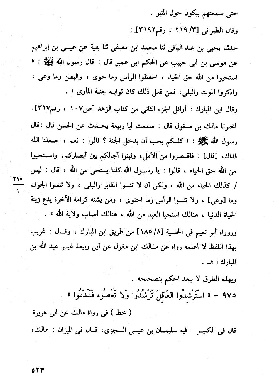 وقال ابن المبارك: أوائل الجزء الثانى من كتاب الزهد [ص 107، رقم 317]: أخبرنا مالك بن مغول قال: سمعت أبا ربيعة يحدث عن الحسن قال: قال رسول اللَّه -صلى اللَّه عليه وسلم-: "كلكم يحب أن يدخل الجنة؟ قالوا: نعم، جعلنا اللَّه فداك، [قال]: فاقصروا من الأمل، وثبتوا آجالكم بين أبصاركم، واستحيوا من اللَّه حق الحياء، قالوا: يا رسول اللَّه كلنا يستحى من اللَّه، قال: ليس كذلك الحياء من اللَّه، ولكن أن لا تنسوا المقابر والبلى، ولا تنسوا الجوف وما [وعى]، ولا تنسوا الرأس وما احتوى، ومن يشته كرامة الآخرة يدع زينة الحياة الدنيا، هنالك استحيا العبد من اللَّه، هنالك أصاب ولاية اللَّه".