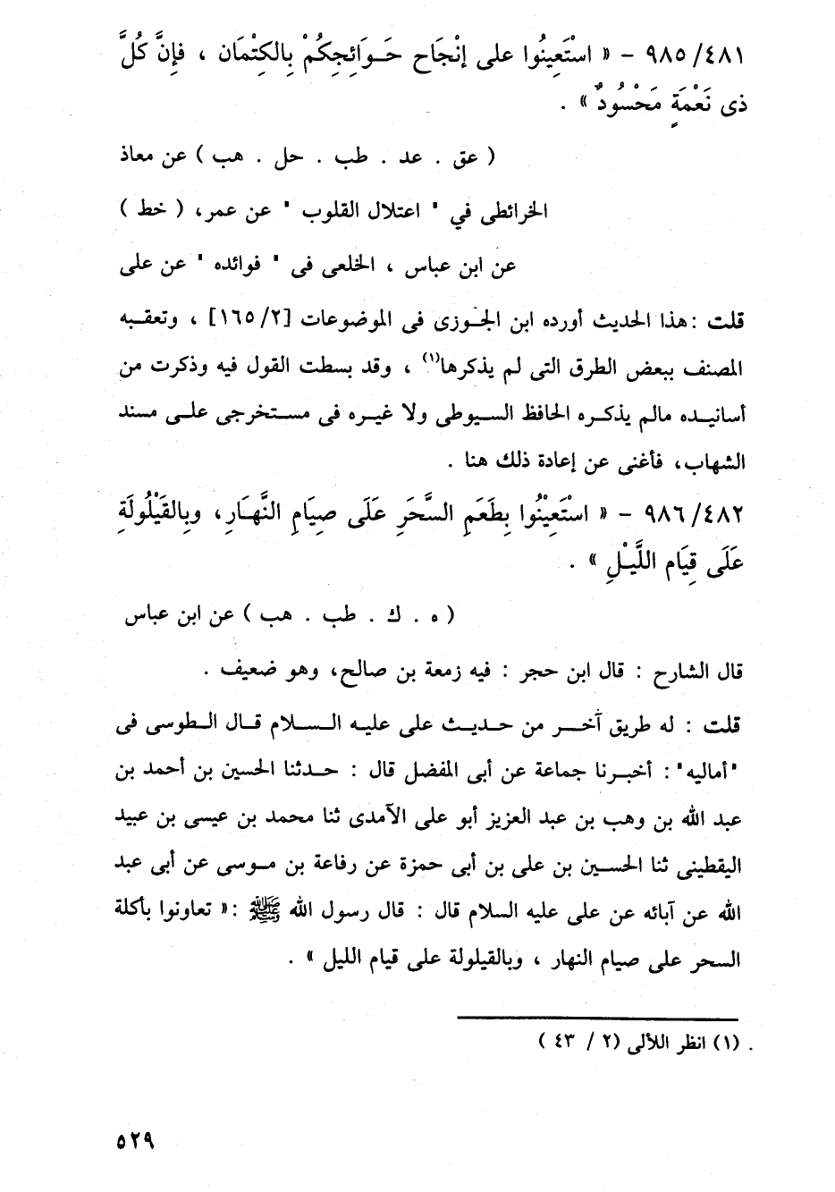 482/ 986 - "اسْتَعِيْنُوا بِطَعَمِ السَّحَرِ عَلَى صِيَامِ النَّهَارِ، وبِالقَيْلُولَةِ عَلَى قِيَام اللَّيْلِ".