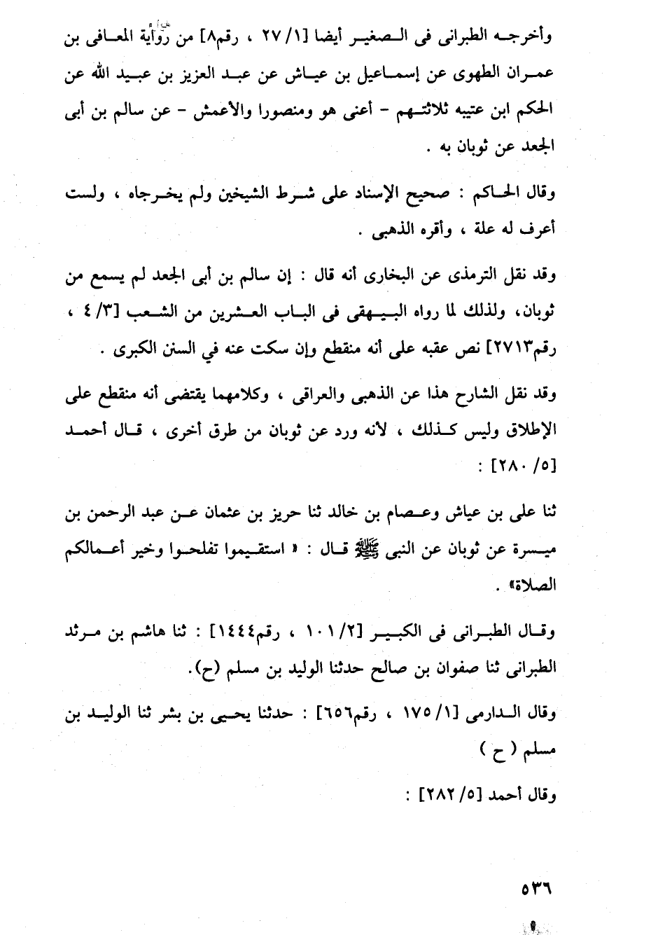 وقد نقل الترمذى عن البخارى أنه قال: إن سالم بن أبي الجعد لم يسمع من ثوبان، ولذلك لما رواه البيهقى في الباب العشرين من الشعب [3/ 4، رقم 2713] نص عقبه على أنه منقطع وإن سكت عنه في السنن الكبرى.