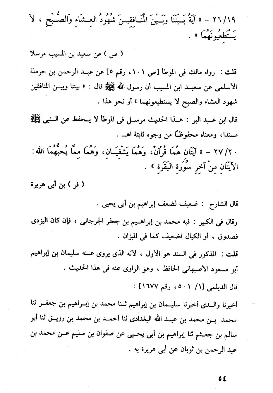 19/ 26 - "آيَةُ بَيْنَنَا وَبَيْنَ المُنَافِقِينَ شُهُودُ العِشَاءِ وَالصُّبْحِ، لَا يَسْتَطِعُيونَهُمَا". (ص) عن سعيد بن المسيب مرسلا