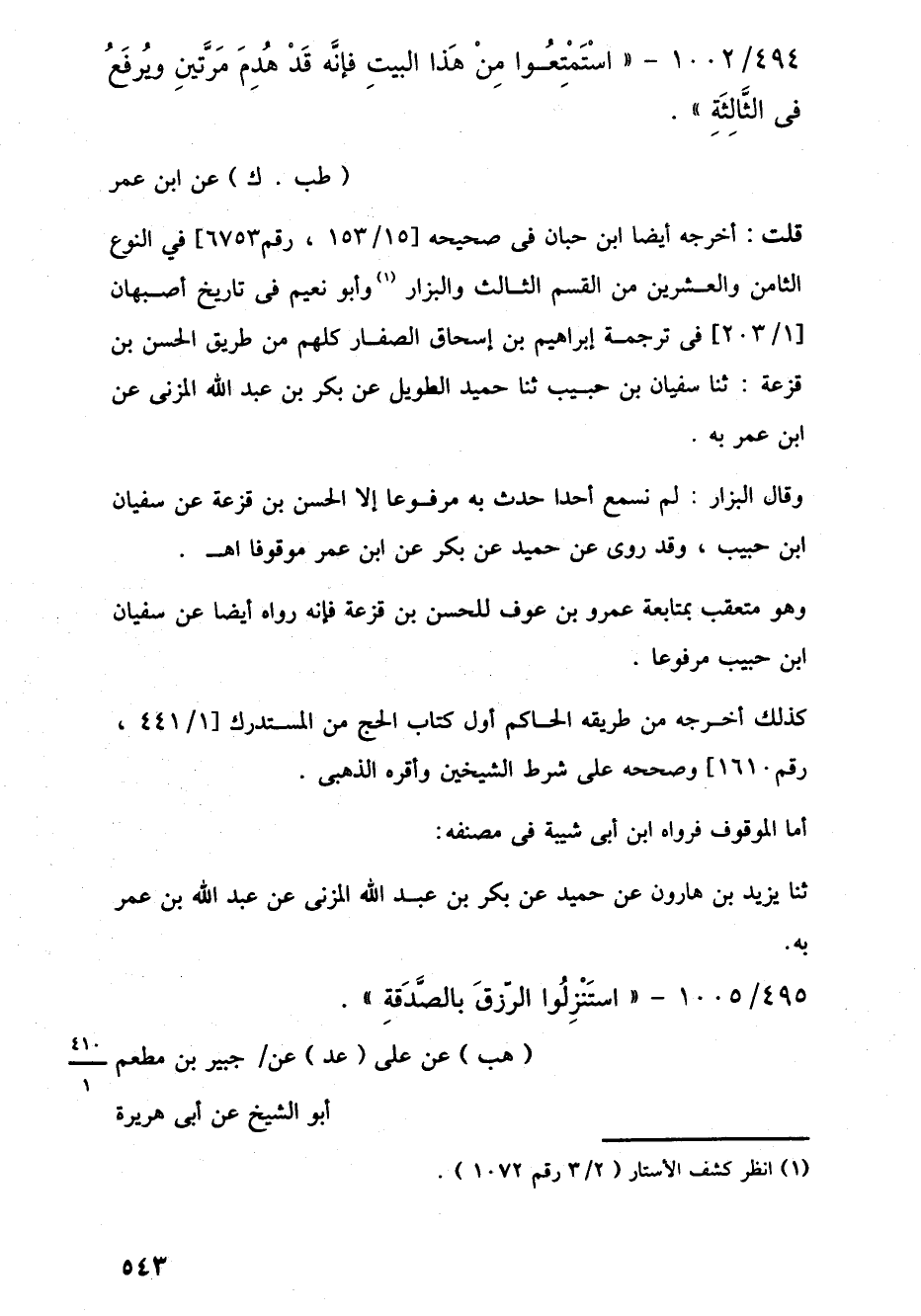 494/ 1002 - "اسْتَمْتعُوا مِنْ هَذا البيت فإِنَّه قَدْ هُدمَ مَرَّتين ويُرفَعُ في الثَّالِثَةِ".