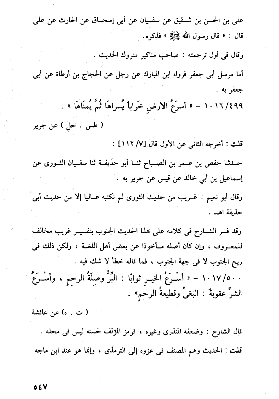 499/ 1016 - "أسرَعُ الأرضِ خَرابًا يُسراهَا ثُمَّ يُمنَاهَا". (طس. حل) عن جرير