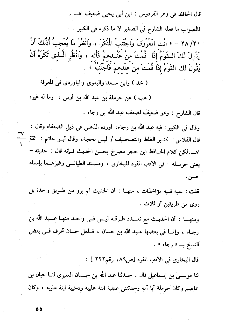 وقال في الكبير: فيه عبد اللَّه بن رجاء، أورده الذهبى في ذيل الضعفاء وقال: قال الفلاس: كثير الغلط والتصحيف ليس بحجة، وقال أبو حاتم: ثقة اهـ. لكن كلام الحافظ ابن حجر مصرح بحسن الحديث فإنه قال: حديثه -يعنى حرملة- في الأدب المفرد للبخارى، ومسند الطيالسى وغيرهما بإسناد حسن.
