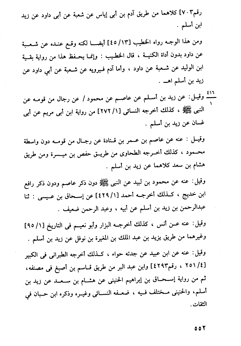 وقيل: عنه عن محمود بن لبيد عن النبي -صلى اللَّه عليه وسلم- دون ذكر عاصم ودون ذكر رافع ابن خديج، كذلك أخرجه أحمد [1/ 429] عن إسحاق بن عيسى: ثنا عبد الرحمن بن زيد بن أسلم عن أبيه، وعبد الرحمن ضعيف.