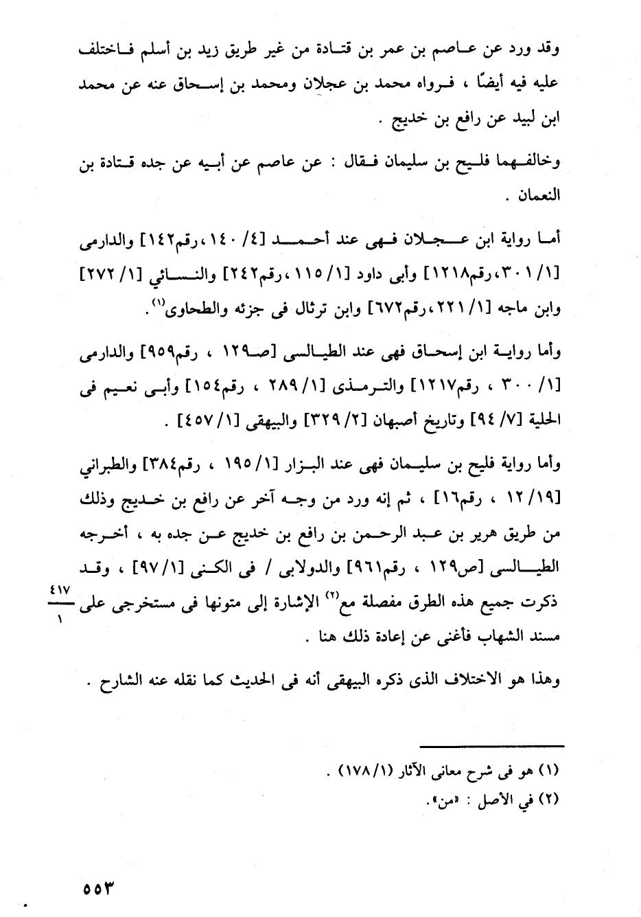 وقد ورد عن عاصم بن عمر بن قتادة من غير طريق زيد بن أسلم فاختلف عليه فيه أيضًا، فرواه محمد بن عجلان ومحمد بن إسحاق عنه عن محمد ابن لبيد عن رافع بن خديج.