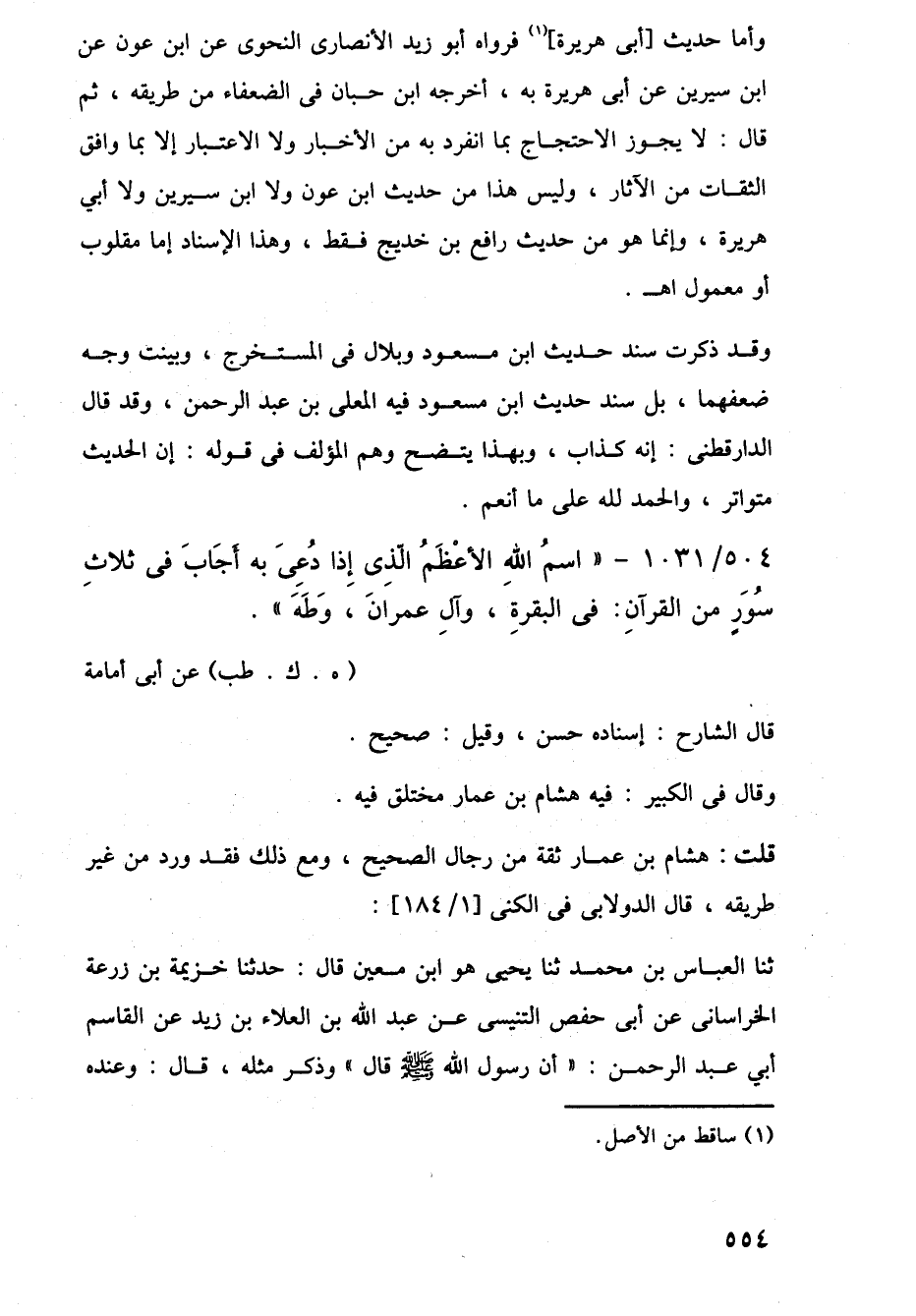 504/ 1031 - "اسمُ اللَّهِ الأَعْظَمُ الَّذِي إِذا دُعِيَ به أجَابَ في ثلاثِ سُوَرٍ من القرآنِ: في البقرةِ، وآلِ عمرانَ، وَطَهَ".