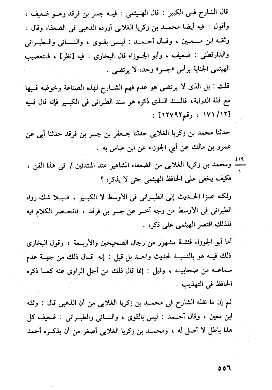 ثم إن ما نقله الشارح في محمد بن زكريا الغلابى من أن الذهبى قال: وثقه ابن معين، وقال أحمد: ليس بالقوى، والنسائى والطبرانى: ضعيف كل هذا باطل لا أصل له، ومحمد بن زكريا الغلابى أصغر من أن يذكره أحمد