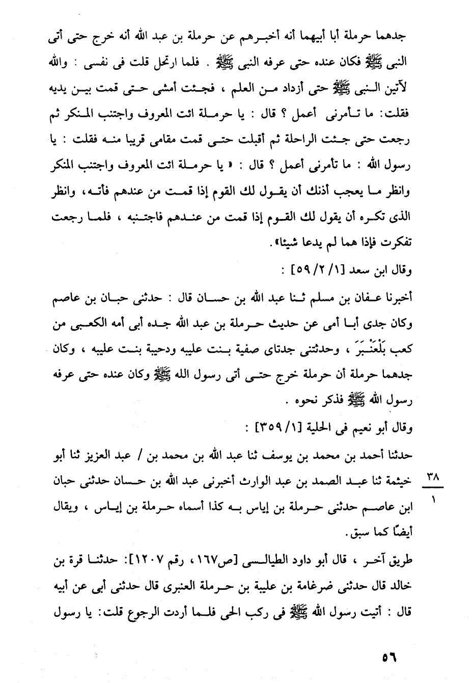جدهما حرملة أبا أبيهما أنه أخبرهم عن حرملة بن عبد اللَّه أنه خرج حتى أتى النبي -صلى اللَّه عليه وسلم- فكان عنده حتى عرفه النبي -صلى اللَّه عليه وسلم-. فلما ارتحل قلت في نفسى: واللَّه لآتين النبي -صلى اللَّه عليه وسلم- حتى أزداد من العلم، فجئت أمشى حتى قمت بين يديه فقلت: ما تأمرنى أعمل؟ قال: يا حرملة ائت المعروف واجتنب المنكر ثم رجعت حتى جئت الراحلة ثم أقبلت حتى قمت مقامى قريبا منه فقلت: يا رسول اللَّه: ما تأمرنى أعمل؟ قال: "يا حرملة ائت المعروف واجتنب المنكر وانظر ما يعجب أذنك أن يقول لك القوم إذا قمت من عندهم فأته، وانظر الذي تكره أن يقول لك القوم إذا قمت من عندهم فاجتنبه، فلما رجعت تفكرت فإذا هما لم يدعا شيئا".