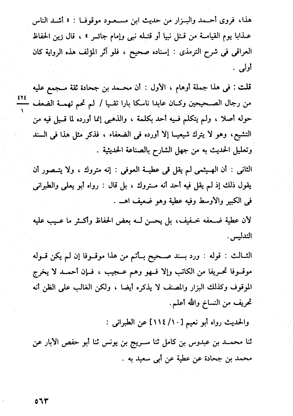 هذا، فروى أحمد والبزار من حديث ابن مسعود موقوفا: "أشد الناس عذابا يوم القيامة من قتل نبيا أو قتله نبي وإمام جائر"، قال زين الحفاظ العراقى في شرح الترمذى: إسناده صحيح، فلو آثر المؤلف هذه الرواية كان أولى.