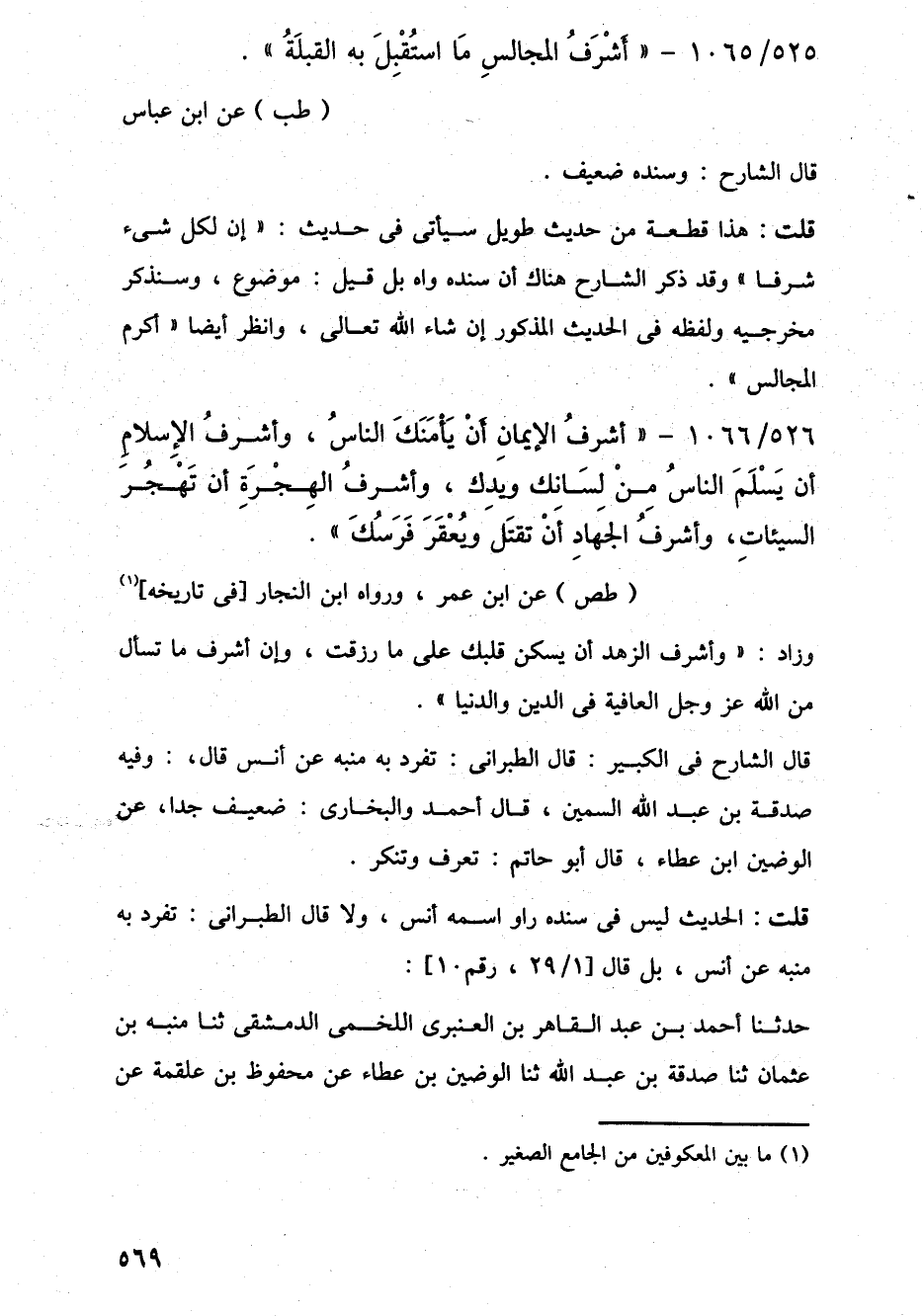 525/ 1065 - "أَشْرَفُ المجالسِ مَا استُقْبِلَ به القبلَةُ". (طب) عن ابن عباس