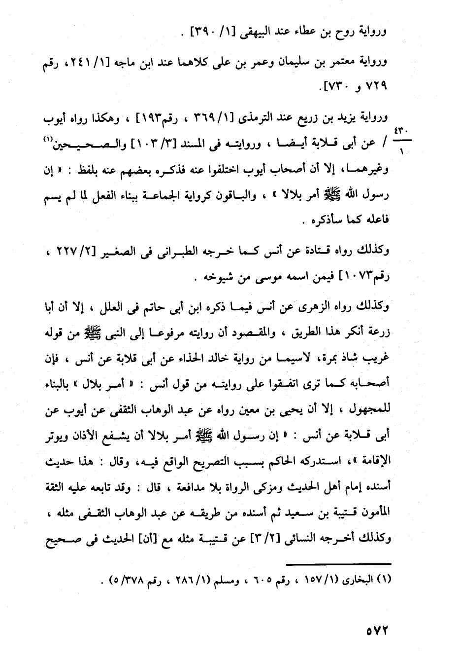وكذلك رواه الزهرى عن أنس فيما ذكره ابن أبي حاتم في العلل، إلا أن أبا زرعة أنكر هذا الطريق، والمقصود أن روايته مرفوعًا إلى النبي -صلى اللَّه عليه وسلم- من قوله غريب شاذ بمرة، لا سيما من رواية خالد الحذاء عن أبي قلابة عن أنس، فإن أصحابه كما ترى اتفقوا على روايته من قول أنس: "أمر بلال" بالبناء للمجهول، إلا أن يحيى بن معين رواه عن عبد الوهاب الثقفى عن أيوب عن أبي قلابة عن أنس: "إن رسول اللَّه -صلى اللَّه عليه وسلم- أمر بلالًا أن يشفع الأذان ويوتر الإقامة"، استدركه الحاكم بسبب التصريح الواقع فيه، وقال: هذا حديث أسنده إمام أهل الحديث ومزكى الرواة بلا مدافعة، قال: وقد تابعه عليه الثقة المأمون قتيبة بن سعيد ثم أسنده من طريقه عن عبد الوهاب الثقفى مثله، وكذلك أخرجه النسائى [2/ 3] عن قتيبة مثله مع [أن] الحديث في صحيح